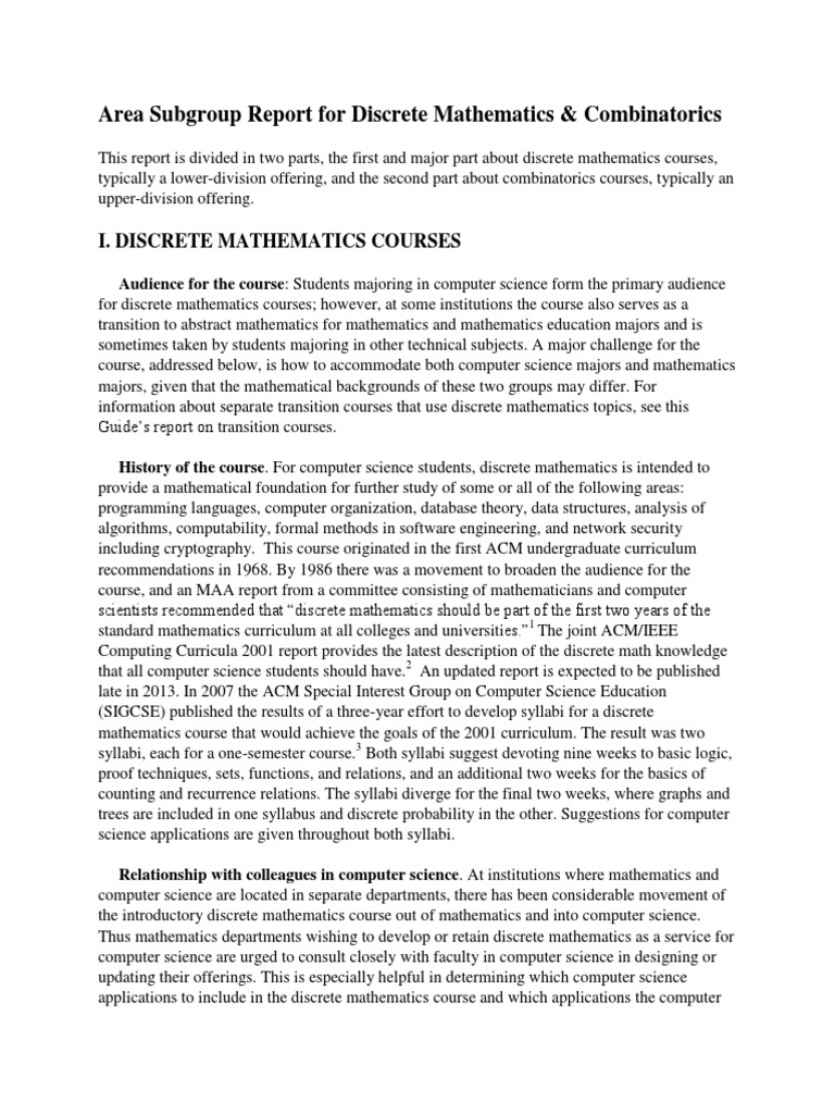 science department is happy to take charge of itself. It is also desirable for mathematics departments to ensure that course instructors have enough knowledge of computer science to be able to indicate relationships between the course topics and future computer science topics. As is the case for most mathematics service courses, the lengthy list of topics desired by a client department can create tension between including all the material and ensuring that students attain the proficiency desired by the department being served. Another reason for communication between mathematics and computer science faculty is to alleviate this tension. Prerequisites. The preparation of students for discrete mathematics courses varies significantly among institutions. Prerequisites are typically at the level of precalculus but vary from two semesters of calculus to college algebra (or the equivalent at the high school level), and some students algebra skills are rather weak. Thus decisions about the appropriate balance between breadth, depth, and what can be expected from a one-semester course will vary from one institution to another. Cognitive learning goals. Discrete mathematics courses have the following primary cognitive learning goals. These goals are developed in almost all the course topics. Familiarity with the role logical reasoning plays in mathematics: Students should become aware of the basic principles of logical reasoning. They should come to understand the role of precise definitions for deciding whether a given object satisfies a given mathematical term, appreciate the importance of knowing both examples and non-examples of mathematical terms in order to explore statements about them, and know how to use definitions effectively in proofs. They should be familiar with the basic structures of direct proofs, indirect proofs, and proofs by mathematical induction and be able to apply them in a variety of situations. They should be able both to follow elementary mathematical arguments and to identify mistakes in them. Experience with mathematical exploration and conjecture: Students should experience the challenge and pleasure of exploring new concepts, looking for patterns, making conjectures, and trying to decide whether they are true or false. Communication: Students should be able to discuss mathematical ideas coherently with their fellow students and express themselves clearly when giving a proof or counterexample. Connections with applications: Students should come to appreciate connections between mathematical concepts (such as those between general relations on sets and functions or between propositional logic and set properties) and between abstract mathematical ideas and concrete applications (such as those between propositional logic and digital logic circuits or between abstract graphs and scheduling problems). Pedagogy. Because many of the cognitive learning goals aim to improve students ability to evaluate mathematical statements, justify their truth or falsity, and express themselves clearly and precisely, a chief teaching recommendation is to ensure students active participation and give them frequent feedback on their work. Addressing students varied backgrounds: Students come to a discrete mathematics course with a variety of backgrounds and abilities. All the cognitive learning goals are important, but the level at which students will achieve them will vary from student to student and from institution to institution. Instructors can address the fact that students absorb ideas and develop
