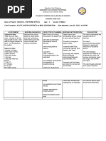 Kevin D. Evangelista BSN2Y1-2B ASSESSMENT Subjective: Hindi ko nararamdaman kapag naiihi ako as verbalized by the patient. Objective: Uncontrollable bed wetting, lost the sense when she has to void V/S: Temp: 36.7 RR: 20 cpm PR: 80 bpm BP: 110/80 Urine output : 4 NURSING DIAGNOSIS Altered urinary elimination related to perineal edema and decreased bladder tone from fetal head pressure during birth. SCIENTIFIC BASIS During vaginal birth the fetal head exerts a great deal of pressure on the bladder and urethra as it passes on the bladders underside. This pressure may leave the bladder with a transient loss of tone that, together with edema surrounding urethra, decreases a womans ability to sense when she has to void. PLANNING After 8 hours of nursing intervention the patient will be able to attempt common measures to initiate voiding. The patient will be able to : Verbalize understanding of the condition. Identify negative factors affecting urinary elimination. Participate in different nursing interventions. INTERVENTION Independent: 1. Assess amount of urine voided during labor and reassess fundal height and position. 2. Assess what measures patient thinks would help her to void. 3. Discuss importance of continuing to drink. 4. Discuss importance of emptying bladder 5. Stress importance of drinking extra water during post partum period RATIONALE EVALUATION