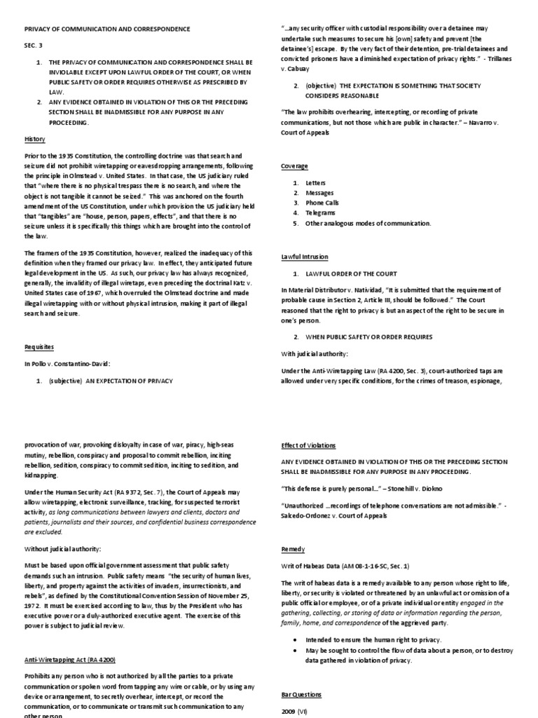 THE PRIVACY OF COMMUNICATION AND CORRESPONDENCE SHALL BE INVIOLABLE EXCEPT UPON LAWFUL ORDER OF THE COURT, OR WHEN PUBLIC SAFETY OR ORDER REQUIRES OTHERWISE AS PRESCRIBED BY LAW. 2. ANY EVIDENCE OBTAINED IN VIOLATION OF THIS OR THE PRECEDING SECTION SHALL BE INADMISSIBLE FOR ANY PURPOSE IN ANY PROCEEDING. History Prior to the 1935 Constitution, the controlling doctrine was that search and seizure did not prohibit wiretapping or eavesdropping arrangements, following the principle in Olmstead v. United States. In that case, the US judiciary ruled that where there is no physical trespass there is no search, and where the object is not tangible it cannot be seized. This was anchored on the fourth amendment of the US Constitution, under which provision the US judiciary held that tangibles are house, person, papers, effects, and that there is no seizure unless it is specifically this things which are brought into the control of the law. The framers of the 1935 Constitution, however, realized the inadequacy of this definition when they framed our privacy law. In effect, they anticipated future legal development in the US. As such, our privacy law has always recognized, generally, the invalidity of illegal wiretaps, even preceding the doctrinal Katz v. United States case of 1967, which overruled the Olmstead doctrine and made illegal wiretapping with or without physical intrusion, making it part of illegal search and seizure.