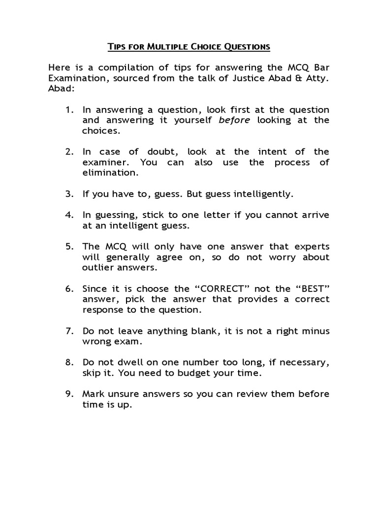 from the talk of Justice Abad & Atty. Abad: 1. In answering a question, look first at the question and answering it yourself before looking at the choices. 2. In case of doubt, look at the intent of the examiner. You can also use the process of elimination. 3. If you have to, guess. But guess intelligently. 4. In guessing, stick to one letter if you cannot arrive at an intelligent guess. 5. The MCQ will only have one answer that experts will generally agree on, so do not worry about outlier answers. 6. Since it is choose the CORRECT not the BEST answer, pick the answer that provides a correct response to the question. 7. Do not leave anything blank, it is not a right minus wrong exam. 8. Do not dwell on one number too long, if necessary, skip it. You need to budget your time. 9. Mark unsure answers so you can review them before time is up.
