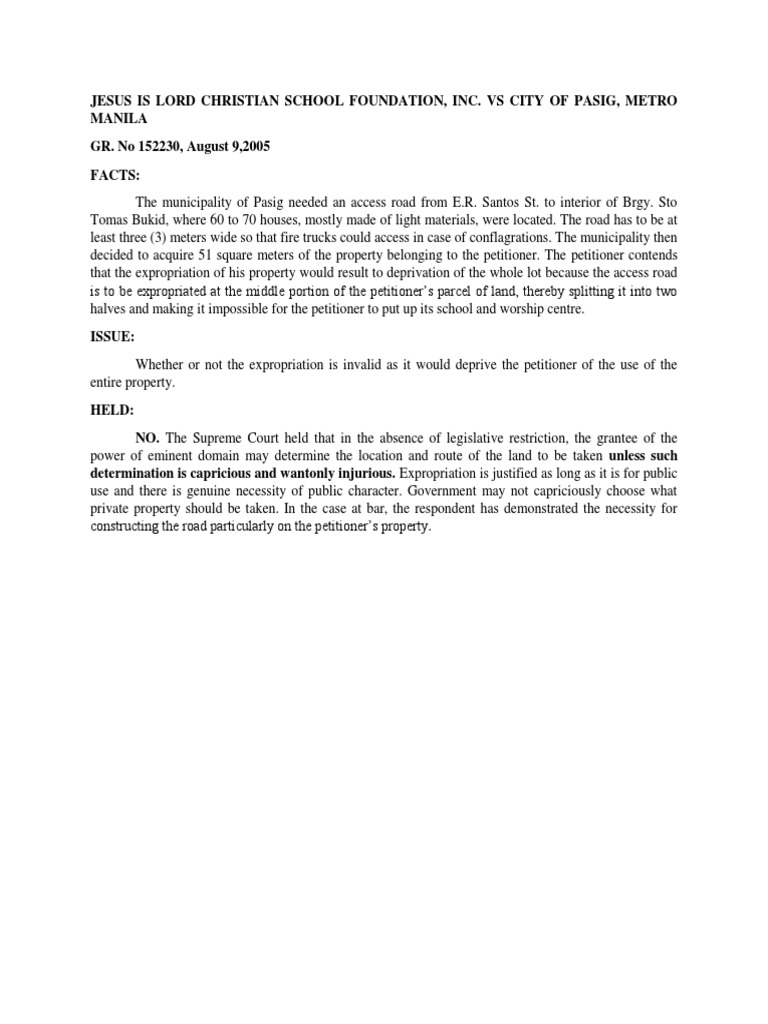 No 152230, August 9,2005 FACTS: The municipality of Pasig needed an access road from E.R. Santos St. to interior of Brgy. Sto Tomas Bukid, where 60 to 70 houses, mostly made of light materials, were located. The road has to be at least three (3) meters wide so that fire trucks could access in case of conflagrations. The municipality then decided to acquire 51 square meters of the property belonging to the petitioner. The petitioner contends that the expropriation of his property would result to deprivation of the whole lot because the access road is to be expropriated at the middle portion of the petitioners parcel of land, thereby splitting it into two halves and making it impossible for the petitioner to put up its school and worship centre. ISSUE: Whether or not the expropriation is invalid as it would deprive the petitioner of the use of the entire property. HELD: NO. The Supreme Court held that in the absence of legislative restriction, the grantee of the power of eminent domain may determine the location and route of the land to be taken unless such determination is capricious and wantonly injurious. Expropriation is justified as long as it is for public use and there is genuine necessity of public character. Government may not capriciously choose what private property should be taken. In the case at bar, the respondent has demonstrated the necessity for constructing the road particularly on the petitioners property.