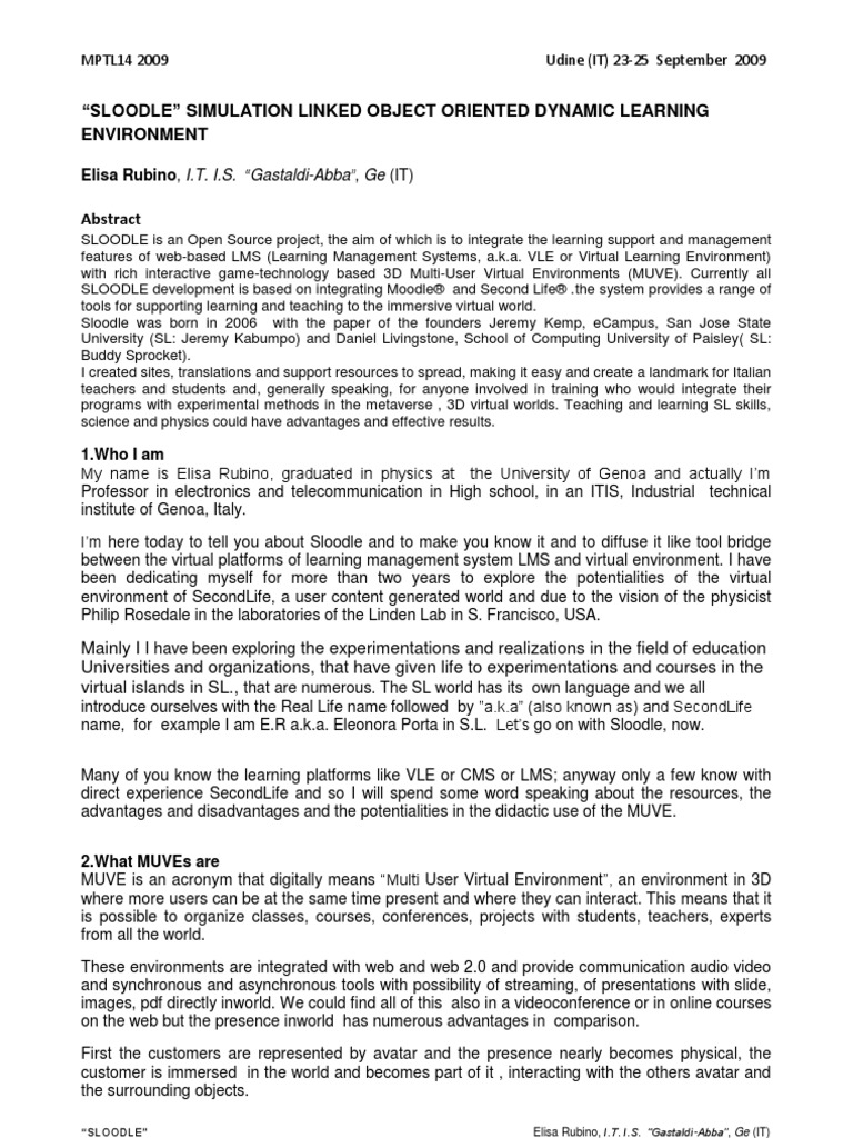 Environments (MUVE). Currently all SLOODLE development is based on integrating Moodle® and