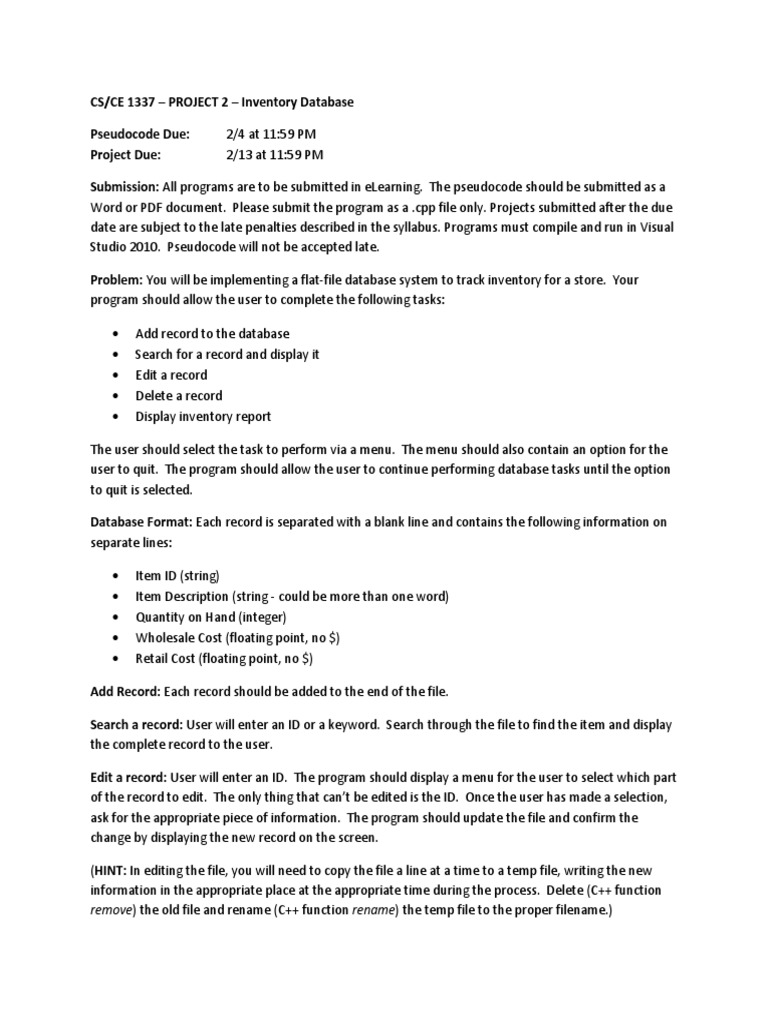 CS/CE 1337 PROJECT 2 Inventory Database Pseudocode Due: Project Due: 2/4 at 11:59 PM 2/13 at 11:59 PM