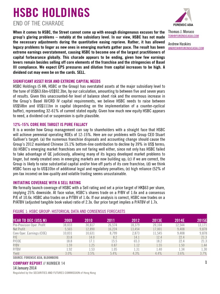 When it comes to HSBC, the Street cannot come up with enough disingenuous excuses for the Thomas J. Monaco groups glaring problems notably at the subsidiary level. In our view, HSBC has not made TOM@FORENSICASIA.COM the necessary adjustments during the quantitative easing reprieve. Rather, it has allowed Andrew Haskins legacy problems to linger as new ones in emerging markets gather pace. The result has been ANDREW@FORENSICASIA.COM extreme earnings overstatement, causing HSBC to become one of the largest practitioners of capital forbearance globally. This charade appears to be ending, given how few earnings levers remain besides selling off core elements of the franchise and the stringencies of Basel III compliance. We expect EPS pressures and dilution from capital increases to be high. A dividend cut may even be on the cards. SELL. SIGNIFICANT ASSET RISK AND EXTREME CAPITAL NEEDS HSBC Holdings (5 HK; HSBC or the Group) has overstated assets at the major subsidiary level to the tune of US$63.6bn-US$92.3bn, by our calculation, amounting to between five and seven years of results. Given this unaccounted-for level of balance sheet risk and the enormous increase in the Groups Basel III/CRD IV capital requirements, we believe HSBC needs to raise between US$58bn and US$111bn in capital (depending on the implementation of a counter-cyclical buffer), representing 32-61% of current stated equity. Given how much new equity HSBC appears to need, a dividend cut or suspension is quite plausible. 12%-15% CORE ROE TARGET IS PURE FALLACY It is a wonder how Group management can say to shareholders with a straight face that HSBC will achieve perennial operating ROEs of 12-15%. Here are our problems with Group CEO Stuart Gullivers target: (a) the numerous franchise disposals and accounting change should cause the Groups 2012 mainland Chinese 15.1% bottom-line contribution to decline by 39% in US$ terms; (b) HSBCs emerging market franchises are not faring well either, since not only has HSBC failed to take advantage of QE judiciously, allowing many of its legacy developed market problems to linger, but newly created ones in emerging markets are now building up; (c) if we are correct, the Group is likely to raise substantial capital and/or hive off parts of its core franchise; (d) we think HSBC faces up to US$10bn of additional legal and regulatory penalties; (e) high reliance (52% of pre-tax income) on low-quality and volatile trading seems unsustainable. INITIATING COVERAGE WITH A SELL RATING We formally launch coverage of HSBC with a Sell rating and set a price target of HK$63 per share, implying 25% downside. At face value, HSBCs shares trade on a P/BV of 1.6x and a consensus P/E of 10.6x. HSBC also trades on a P/TBV of 1.4x. If our analysis is correct, HSBC now trades on a P/ATBV (adjusted tangible book value) ratio of 2.3x. Our price target implies a P/ATBV of 1.7x. FIGURE 1: HSBC GROUP: HISTORICAL DATA AND CONSENSUS FORECASTS YEAR TO DEC (US$ M)