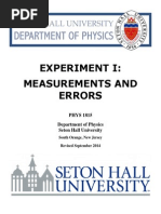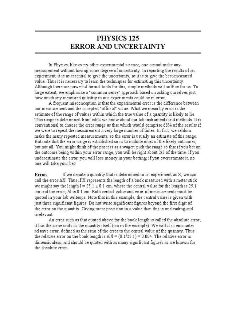 In Physics, like every other experimental science, one cannot make any measurement without having some degree of uncertainty. In reporting the results of an experiment, it is as essential to give the uncertainty, as it is to give the best-measured value. Thus it is necessary to learn the techniques for estimating this uncertainty. Although there are powerful formal tools for this, simple methods will suffice for us. To large extent, we emphasize a "common sense" approach based on asking ourselves just how much any measured quantity in our experiments could be in error. A frequent misconception is that the experimental error is the difference between our measurement and the accepted "official" value. What we mean by error is the estimate of the range of values within which the true value of a quantity is likely to lie. This range is determined from what we know about our lab instruments and methods. It is conventional to choose the error range as that which would comprise 68% of the results if we were to repeat the measurement a very large number of times. In fact, we seldom make the many repeated measurements, so the error is usually an estimate of this range. But note that the error range is established so as to include most of the likely outcomes, but not all. You might think of the process as a wager: pick the range so that if you bet on the outcome being within your error range, you will be right about 2/3 of the time. If you underestimate the error, you will lose money in your betting; if you overestimate it, no one will take your bet! Error: If we denote a quantity that is determined in an experiment as X, we can call the error !X. Thus if X represents the length of a book measured with a meter stick we might say the length l = 25.1 0.1 cm, where the central value for the length is 25.1 cm and the error, !l is 0.1 cm. Both central value and error of measurements must be quoted in your lab writeups. Note that in this example, the central value is given with just three significant figures. Do not write significant figures beyond the first digit of the error on the quantity. Giving more precision to a value than this is misleading and irrelevant. An error such as that quoted above for the book length is called the absolute error; it has the same units as the quantity itself (cm in the example) .We will also encounter relative error, defined as the ratio of the error to the central value of the quantity. Thus the relative error on the book length is !l/l = (0.1/25.1) = 0.004. The relative error is dimensionless, and should be quoted with as many significant figures as are known for the absolute error.