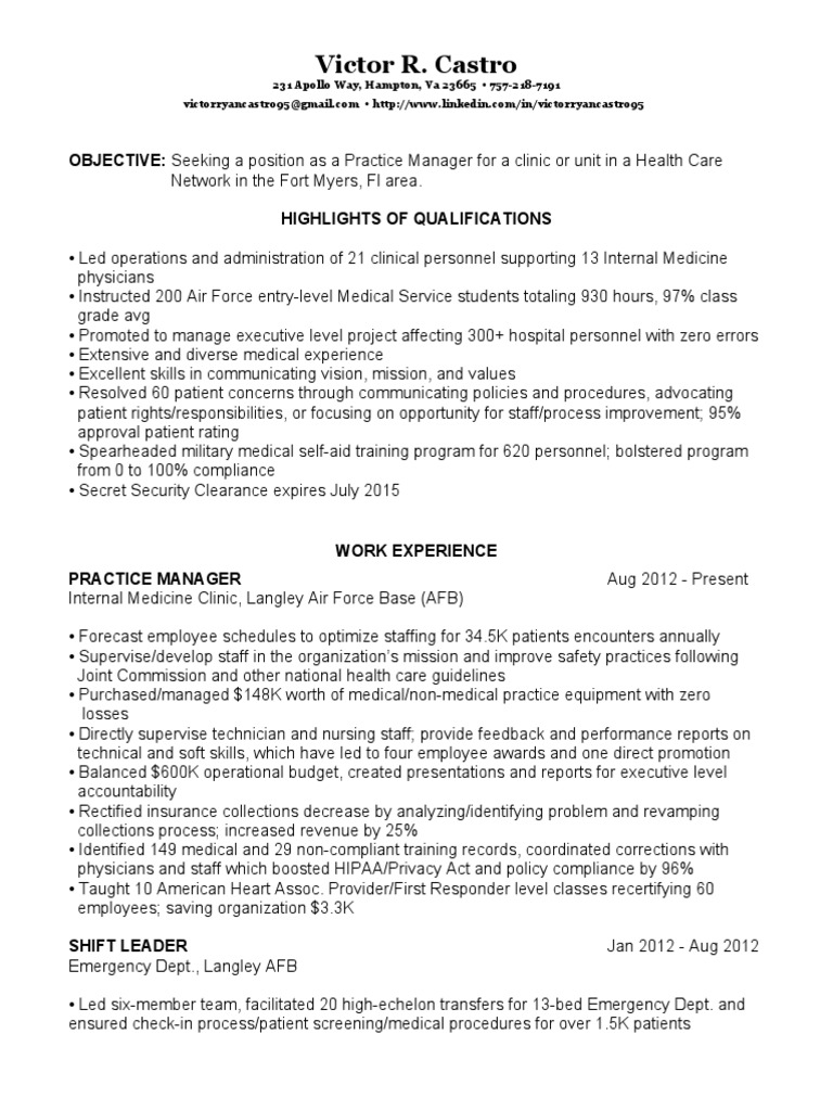 OBJECTIVE: Seeking a position as a Practice Manager for a clinic or unit in a Health Care Network in the Fort Myers, Fl area. HIGHLIGHTS OF QUALIFICATIONS Led operations and administration of 21 clinical personnel supporting 13 Internal Medicine physicians Instructed 200 Air Force entry-level Medical Service students totaling 930 hours, 97% class grade avg Promoted to manage executive level project affecting 300+ hospital personnel with zero errors Extensive and diverse medical experience Excellent skills in communicating vision, mission, and values Resolved 60 patient concerns through communicating policies and procedures, advocating patient rights/responsibilities, or focusing on opportunity for staff/process improvement; 95% approval patient rating Spearheaded military medical self-aid training program for 620 personnel; bolstered program from 0 to 100% compliance Secret Security Clearance expires July 2015