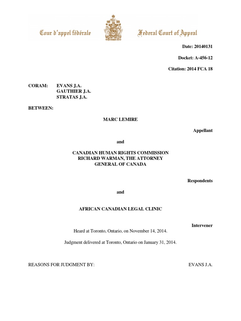 Date: 20140131 Docket: A-456-12 Citation: 2014 FCA 18 CORAM: EVANS J.A. GAUTHIER J.A. STRATAS J.A. BETWEEN: MARC LEMIRE Appellant and CANADIAN HUMAN RIGHTS COMMISSION RICHARD WARMAN, THE ATTORNEY GENERAL OF CANADA Respondents and AFRICAN CANADIAN LEGAL CLINIC Intervener