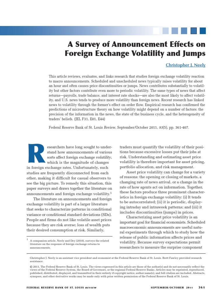 esearchers have long sought to understand how announcements of various sorts affect foreign exchange volatility, which is the magnitude of changes in foreign exchange rates. Unfortunately, such studies are frequently disconnected from each other, making it difficult for casual observers to see the big picture. To remedy this situation, this paper surveys and draws together the literature on announcements and foreign exchange volatility.1 The literature on announcements and foreign exchange volatility is part of a larger literature that seeks to characterize patterns in conditional variance or conditional standard deviations (SDs). People and firms do not like volatile asset prices because they are risk averse; loss of wealth puts their desired consumption at risk. Similarly,