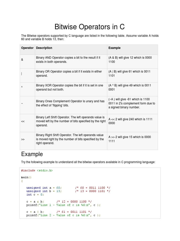 Try the following example to understand all the bitwise operators available in C programming language: #include <stdio.h> main() { unsigned int a = 60; unsigned int b = 13; int c = 0; /* 60 = 0011 1100 */ /* 13 = 0000 1101 */