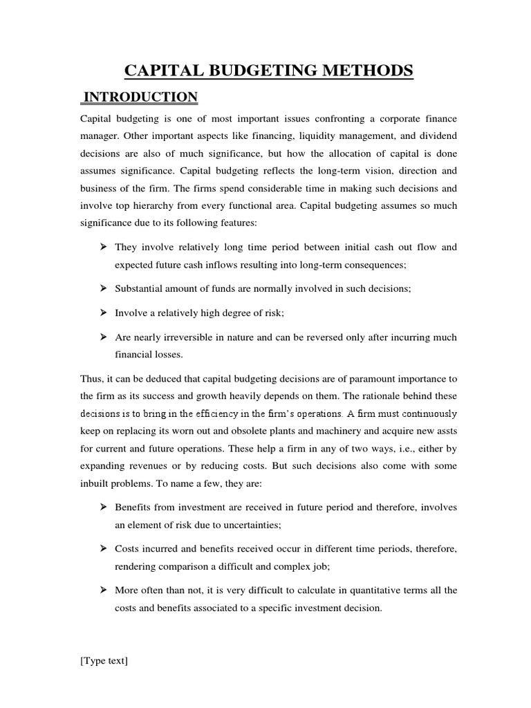 Capital budgeting is a complex process comprising five distinct phases a. Identification of potential investment opportunities or proposal generation; b. Evaluation of available alternative proposals in the light of the objective of shareholders wealth maximization; c. Selection of best project proposal from amongst the available alternatives or decision making; d. Implementation of the selected project proposal; and e. Performance Review or follow-up. Firms are basically confronted with three types of capital budgeting decisions: (i) Accept-reject decisions: In any capital budgeting project this is the most fundamental decision to make. As a normally accepted principle, all those projects which yield a rate of return greater than required rate of return are accepted and rest stand rejected. This principle allows selection of all independent projects. (ii) Mutually Exclusive Project Decisions: Such projects are those which compete with other projects in such a way that selection of one of them renders selection of other projects impossible. Hence, amongst from all projects one giving highest return is selected. (iii) Capital Rationing Decisions: If the firm were having unlimited funds, all the independent projects yielding a rate of return higher than required rate of return would have been selected, but in reality such situation seldom prevails. The firms have a fixed capital budget creating a competition among number of alternative proposals. The firm allocates funds to these proposals in such a way as to maximize long-term return. This process is known as capital rationing. [Type text]
