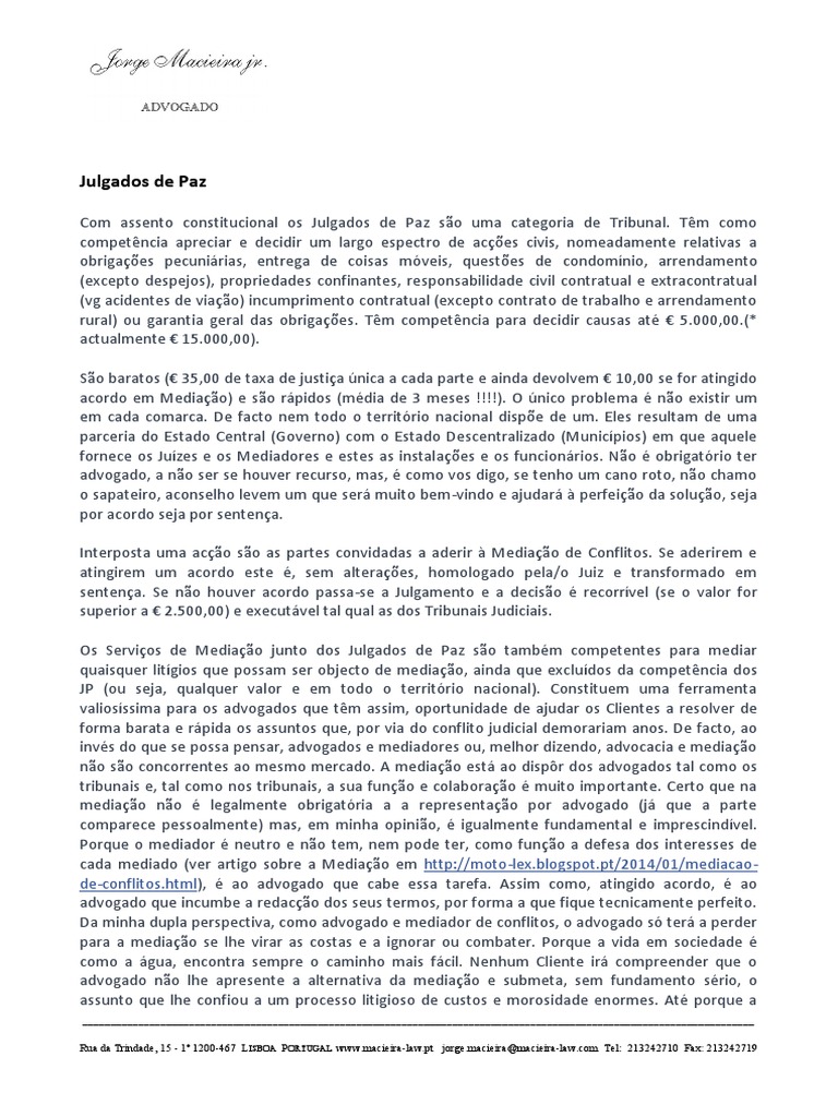 Com assento constitucional os Julgados de Paz so uma categoria de Tribunal. Tm como competncia apreciar e decidir um largo espectro de aces civis, nomeadamente relativas a obrigaes pecunirias, entrega de coisas mveis, questes de condomnio, arrendamento (excepto despejos), propriedades confinantes, responsabilidade civil contratual e extracontratual (vg acidentes de viao) incumprimento contratual (excepto contrato de trabalho e arrendamento rural) ou garantia geral das obrigaes. Tm competncia para decidir causas at 5.000,00.(* actualmente 15.000,00). So baratos ( 35,00 de taxa de justia nica a cada parte e ainda devolvem 10,00 se for atingido acordo em Mediao) e so rpidos (mdia de 3 meses !!!!). O nico problema no existir um em cada comarca. De facto nem todo o territrio nacional dispe de um. Eles resultam de uma parceria do Estado Central (Governo) com o Estado Descentralizado (Municpios) em que aquele fornece os Juzes e os Mediadores e estes as instalaes e os funcionrios. No obrigatrio ter advogado, a no ser se houver recurso, mas, como vos digo, se tenho um cano roto, no chamo o sapateiro, aconselho levem um que ser muito bem-vindo e ajudar perfeio da soluo, seja por acordo seja por sentena. Interposta uma aco so as partes convidadas a aderir Mediao de Conflitos. Se aderirem e atingirem um acordo este , sem alteraes, homologado pela/o Juiz e transformado em sentena. Se no houver acordo passa-se a Julgamento e a deciso recorrvel (se o valor for superior a 2.500,00) e executvel tal qual as dos Tribunais Judiciais. Os Servios de Mediao junto dos Julgados de Paz so tambm competentes para mediar quaisquer litgios que possam ser objecto de mediao, ainda que excludos da competncia dos JP (ou seja, qualquer valor e em todo o territrio nacional). Constituem uma ferramenta valiosssima para os advogados que tm assim, oportunidade de ajudar os Clientes a resolver de forma barata e rpida os assuntos que, por via do conflito judicial demorariam anos. De facto, ao invs do que se possa pensar, advogados e mediadores ou, melhor dizendo, advocacia e mediao no so concorrentes ao mesmo mercado. A mediao est ao dispr dos advogados tal como os tribunais e, tal como nos tribunais, a sua funo e colaborao muito importante. Certo que na mediao no legalmente obrigatria a a representao por advogado (j que a parte comparece pessoalmente) mas, em minha opinio, igualmente fundamental e imprescindvel. Porque o mediador neutro e no tem, nem pode ter, como funo a defesa dos interesses de cada mediado (ver artigo sobre a Mediao em http://moto-lex.blogspot.pt/2014/01/mediacaode-conflitos.html), ao advogado que cabe essa tarefa. Assim como, atingido acordo, ao advogado que incumbe a redaco dos seus termos, por forma a que fique tecnicamente perfeito. Da minha dupla perspectiva, como advogado e mediador de conflitos, o advogado s ter a perder para a mediao se lhe virar as costas e a ignorar ou combater. Porque a vida em sociedade como a gua, encontra sempre o caminho mais fcil. Nenhum Cliente ir compreender que o advogado no lhe apresente a alternativa da mediao e submeta, sem fundamento srio, o assunto que lhe confiou a um processo litigioso de custos e morosidade enormes. At porque a