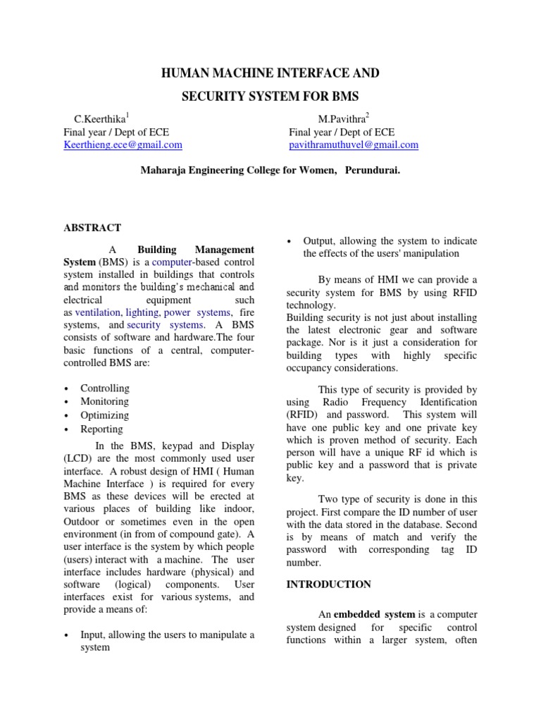 By means of HMI we can provide a security system for BMS by using RFID technology. Building security is not just about installing the latest electronic gear and software package. Nor is it just a consideration for building types with highly specific occupancy considerations. This type of security is provided by using Radio Frequency Identification (RFID) and password. This system will have one public key and one private key which is proven method of security. Each person will have a unique RF id which is public key and a password that is private key. Two type of security is done in this project. First compare the ID number of user with the data stored in the database. Second is by means of match and verify the password with corresponding tag ID number. INTRODUCTION An embedded system is a computer system designed for specific control functions within a larger system, often