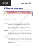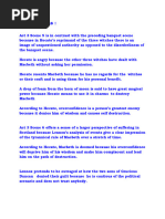 Act 3 Scene 1 Banquo: Youre king, Cawdor, Glamis, everything, just as the witches foretold, but I fear you did something evil in order to get where you are, but the witches also said, your descendants wont inherit your royalty. If the witches predictions are coming true, maybe my predictions will come true as well? Ah! Nevermind. Macbeth: Heres our chief guest Lady Macbeth: if you werent here, this feast would have been wasted Macbeth: (to Banquo) we have a formal dinner tonight and you are the guest of honour! Banquo: I will forever be loyal to you. Macbeth: Are you going for a ride this afternoon? Banquo: Yes my Lord. Macbeth: We need your good advice, but it can wait until tomorrow. How far are you riding? Banquo: Ill be gone till supper time. Macbeth: Dont miss our feast. Banquo: I wont. Macbeth: Our bloody cousins have fled to England and Ireland, not confessing to the murder of their father. To your horse now, (pause) is Fleance going with you? Banquo: Yes, it is time for us to go. Macbeth: I wish you a safe journey. (To the Lords) Enjoy the feast as you please. (To the attendant) Are those men waiting for me? Attendant: Yes my Lord they are at the palace gate. Macbeth: Bring them before me. Exit Attendant My genius is rebuked. As it is said. Mark Antonys was by Ceaser. He chid the sisters when they put the name of king upon me, And bade them speak to him; then, prophet-like, they hailed him father to a line of kings. Upon my head they placed a fruitless crown, and put a barren sceptre in my gripe, thence to be wrenched with an unlineal hand, no son of mine succeeding. Ift be so, for Banquos issue have I filed my mind; for them the gracious Duncan have I murdered. Whos there? Re-enter Attendant and two murderers Did we not speak together, yesterday? 1st Murderer: Yes your highness. Macbeth: Have you made your decision after discovering how Banquo has cheated you? Our target is the same. 1st Murderer: Yes we found Banquos ill deeds thanks to you. Macbeth: Do you think we could let this go? 1st Murderer: No, we are men we will do something. Macbeth: Then I leave Banquo in your hands. 2nd Murderer: We shall perform your commands 1st Murderer: With our lives. Macbeth: Kill him tonight; Ill be with you shortly. Dont forget Fleance. Exit Murderers Scene 2 Enter Lady Macbeth Lady Macbeth: Why are you alone on the night of a feast? The guests are waiting. Macbeth: I have done horrible deeds and the guilt building up inside me makes me feel uneasy and unable to sleep. Lady Macbeth: You must man up. Look happier. Dont let our guests see your displeasure and guilt. Macbeth: Ill try, for you. Keep Banquo in your prayers, he was a good man.