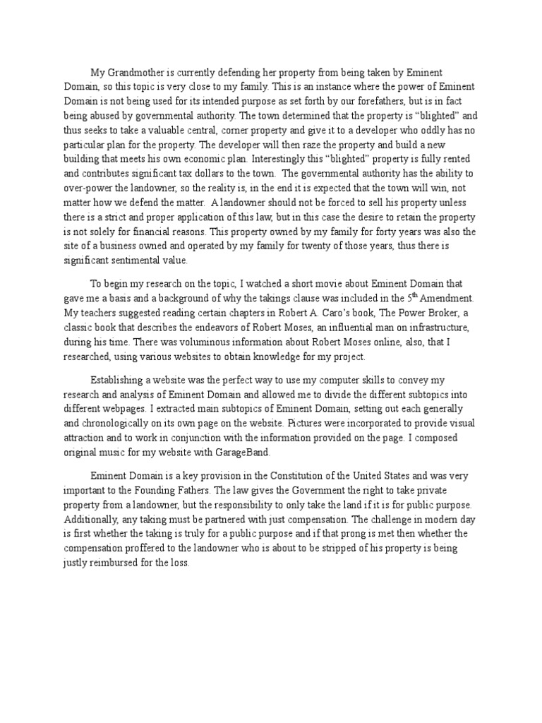 This is an instance where the power of Eminent Domain is not being used for its intended purpose as set forth by our forefathers, but is in fact being abused by governmental authority. The town determined that the property is blighted and thus seeks to take a valuable central, corner property and give it to a developer who oddly has no particular plan for the property. The developer will then ra!e the property and build a new building that meets his own economic plan. "nterestingly this blighted property is fully rented and contributes significant ta# dollars to the town. The governmental authority has the ability to over$power the landowner, so the reality is, in the end it is e#pected that the town will win, not matter how we defend the matter. % landowner should not be forced to sell his property unless there is a strict and proper application of this law, but in this case the desire to retain the property is not solely for financial reasons. This property owned by my family for forty years was also the site of a business owned and operated by my family for twenty of those years, thus there is significant sentimental value. To begin my research on the topic, " watched a short movie about Eminent Domain that gave me a basis and a background of why the takings clause was included in the &th %mendment. My teachers suggested reading certain chapters in 'obert %. (aro)s book, The *ower +roker, a classic book that describes the endeavors of 'obert Moses, an influential man on infrastructure, during his time. There was voluminous information about 'obert Moses online, also, that " researched, using various websites to obtain knowledge for my pro,ect. Establishing a website was the perfect way to use my computer skills to convey my research and analysis of Eminent Domain and allowed me to divide the different subtopics into different webpages. " e#tracted main subtopics of Eminent Domain, setting out each generally and chronologically on its own page on the website. *ictures were incorporated to provide visual attraction and to work in con,unction with the information provided on the page. " composed original music for my website with Garage+and. Eminent Domain is a key provision in the (onstitution of the -nited .tates and was very important to the /ounding /athers. The law gives the Government the right to take private property from a landowner, but the responsibility to only take the land if it is for public purpose. %dditionally, any taking must be partnered with ,ust compensation. The challenge in modern day is first whether the taking is truly for a public purpose and if that prong is met then whether the compensation proffered to the landowner who is about to be stripped of his property is being ,ustly reimbursed for the loss.