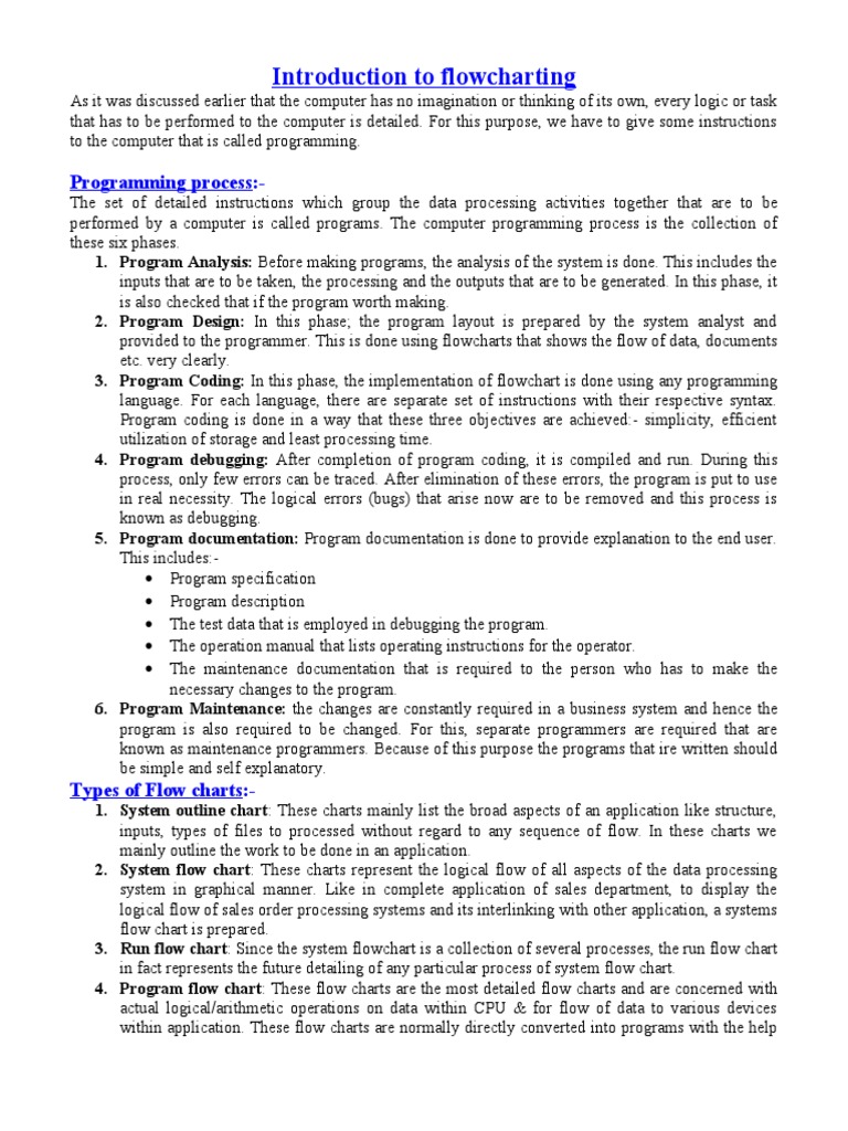 %ypes of &low charts:1. 'ystem outline chart# These charts mainly list the broad aspects of an application like structure, inputs, types of files to processed without regard to any se)uence of flow. In these charts we mainly outline the work to be done in an application. 2. 'ystem flow chart# These charts represent the logical flow of all aspects of the data processing system in graphical manner. *ike in complete application of sales department, to display the logical flow of sales order processing systems and its interlinking with other application, a systems flow chart is prepared. 3. (un flow chart# +ince the system flowchart is a collection of several processes, the run flow chart in fact represents the future detailing of any particular process of system flow chart. . Program flow chart# These flow charts are the most detailed flow charts and are concerned with actual logical,arithmetic operations on data within -!. / for flow of data to various devices within application. These flow charts are normally directly converted into programs with the help