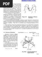 In spur and helical gearing, backlash allowance is usually obtained by sinking the hob deeper into the blank than the theoretically standard depth. Further, it is true that any increase or decrease in center distance of two gears in any mesh will cause an increase or decrease in backlash. Thus, this is an alternate way of designing backlash into the system. In the following, we give the fundamental equations for the determination of backlash in a single gear mesh. For the determination of backlash in gear trains, it is necessary to sum the backlash of each mated gear pair. However, to obtain the total backlash for a series of meshes, it is necessary to take into account the gear ratio of each mesh relative to a chosen reference shaft in the gear train. For details, see Reference 10 at the end of the technical section. 14.1 Definition Of Backlash Backlash is defined in Figure 14-2(a) as the excess thickness of tooth space over the thickness of the mating tooth. There are two basic ways in which backlash arises: tooth thickness is below the zero backlash value; and the operating center distance is greater than the zero backlash value.