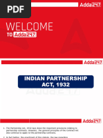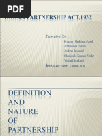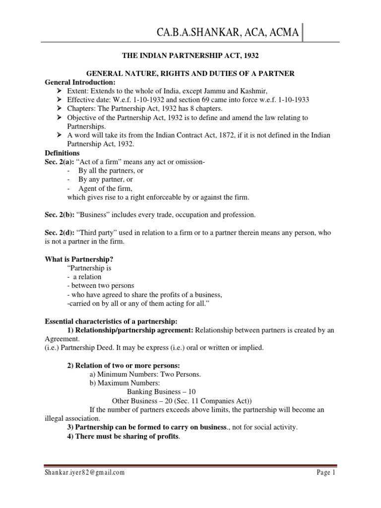 THE INDIAN PARTNERSHIP ACT, 1932 GENERAL NATURE, RIGHTS AND DUTIES OF A PARTNER General Introduction: Extent: Extends to the whole of India, except Jammu and Kashmir, Effective date: W.e.f. 1-10-1932 and section 69 came into force w.e.f. 1-10-1933 Chapters: The Partnership Act, 1932 has 8 chapters. Objective of the Partnership Act, 1932 is to define and amend the law relating to Partnerships. A word will take its from the Indian Contract Act, 1872, if it is not defined in the Indian Partnership Act, 1932. Definitions Sec. 2(a): Act of a firm means any act or omission- By all the partners, or - By any partner, or - Agent of the firm, which gives rise to a right enforceable by or against the firm. Sec. 2(b): Business includes every trade, occupation and profession. Sec. 2(d): Third party used in relation to a firm or to a partner therein means any person, who is not a partner in the firm. What is Partnership? Partnership is - a relation - between two persons - who have agreed to share the profits of a business, -carried on by all or any of them acting for all. Essential characteristics of a partnership: 1) Relationship/partnership agreement: Relationship between partners is created by an Agreement. (i.e.) Partnership Deed. It may be express (i.e.) oral or written or implied. 2) Relation of two or more persons: a) Minimum Numbers: Two Persons. b) Maximum Numbers: Banking Business 10 Other Business 20 (Sec. 11 Companies Act)) If the number of partners exceeds above limits, the partnership will become an illegal association. 3) Partnership can be formed to carry on business., not for social activity. 4) There must be sharing of profits.
