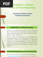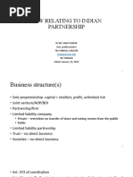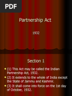5) Mutual agency Cardinal principle: In the business of partnership may be carried on by all the partners or any of them acting for all. In case of Cox v Hickman, the honourable court absorbed that a partner assumes a two-fold character 1) He is agent of the firm, so he can bind the firm by his act, provided a) The act is within the scope of his authority, b) The act is done in the firms name, and c) The act is done for the purpose of the firm. 2) He is the principal for the acts of other partners. WHO MAY BE A PARTNER? A person, who is competent to enter into a contract, can be a partner [Sec. 11 of the Indian Contract Act, 1872] Company : Yes Foreigner : Yes, if alien friend. Minor : A minor can be ADMITTED for the benefit of a partnership firm. The following persons are not deemed to be partners: 1) Members of HUF, carrying on family business 2) A Burmese Buddhist husband and wife carrying on a business TRUE TEST OF PARTNERSHIP Sec. 4 contains five basic conditions. These conditions are a True Test of partnership Intention cannot change the character. CASES WHERE NO PARTNERSHIP EXISTS [Sec. 6] Joint owners, sharing gross returns [Explanation I of Sec.6]: Sharing of Profits [Explanation-II of Sec.6] PARTNERSHIP AT WILL [Sec.7] Meaning (Sec 7): A partnership is said to be at will, when no provision is made in the Deed i. For the duration of their partnership, or ii. For the determination of their partnership Retirement[32(1)]: Where the partnership is at will, by giving notice to all the other partners of ones intention to retire. Examples of Partnership at will: a) When the partners of a particular Partnership decide to continue the Partnership after completion of the adventure b) When a Partnership is entered into fixed term, but the Partners carry on business even after such period c) When the duration of Partnership is not fixed