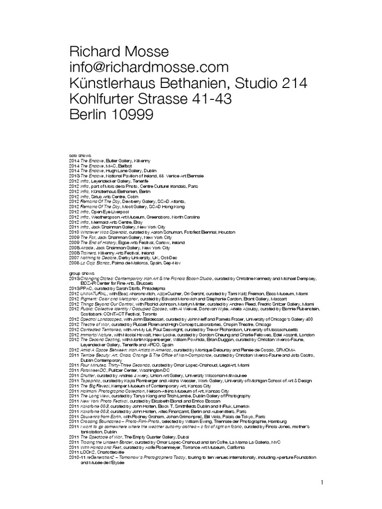 2010 B-Sides: A Dialogue With Contemporary US Photography, curated by Jennifer Ward, Fotofest Houston 2010 ORT, curated by Martin Fengel and Elmar Bambach, Rathausgalerie, Kunsthalle Munich 2010 Leben Elementar , curated by Christophe Tannert, Fototriage Trier 2010 NY/Prague 6, selected by Katie Holten, curated by Omar Lopez-Chahoud, Futura Project, Prague 2010 Landscapes of Quarantine, Storefront for Art and Architecture, New York 2010 AIB Art Prize, Royal Dublin Society, Ireland 2010 Postcards from the Celtic Tiger, curated by Peggy Sue Amison, Xuhui Art Museum, Shanghai 2010 Semiramide, by Gioachino Rossini, Vlaamse Opera, Antwerp, Royal Danish Opera, Copenhagen, Edinbugh Festival 2010 Guatephotofestival, curated by Adriana Teresa, Merida Museum of Modern Art, Guatemala 2010 Lost & Found , curated by Julia van Mourik, Theatrum Anatomicum, Amsterdam 2010 Para Bellum 12mm, curated by Marti Peran, Ca lArenas, Museu de Mataro, Barcelona 2010 Interrupted Landscapes, Champion Contemporary, Austin 2009 Embedded Art , Akademie der Kunste, Berlin 2009 The Dialectics of Terror, curated by Joshua Simon, Chelsea Art Museum 2008 Media Matters, Friedrich Kittler and Technoculture, curated by Seth Kim-Cohen, Tate Modern 2008 Yale Photography MFA 2008, Yale School of Art, New Haven, Danziger Projects, Gallery 339 2008 New Insight, Art Chicago, one of two students selected from the Yale School of Art MFA 2007 C NYC, Phillips de Pury, selected work from C International Photo Magazine 7-26 Sept 2007 2007 Documenta XII Magazine Project, part of Multitudes Journal, France 2006 Palestine Film Festival, Barbican Centre, London 2005 Bloomberg New Contemporaries, touring Barbican Art Gallery, Cornerhouse Manchester, Bristol 2005 Perspective, Ormeau Baths Gallery, Belfast. Winner of the Perspective prize, selected by Terry Atkinson and Ariella Azoulay. text+press 2012 Arte, Kunstlerhaus Bethanien > Richard Mosse 2012 The Guardian, Photographer Richard Mosse to represent Ireland at Venice Biennale by Sean OHagan 2012 The Irish Times, Richard Mosse to represent Ireland at Venice Biennale 2013 by Laurence Mackin 2012 Images Magazine, leon de photo, interview by Bastien Manach 2012 POLITIKEN, Kan krig vre candyfloss 2012 La Nacion, Sunday Magazine (Argentina), interview by Daniel Merle 2012 The New York Times, Fiction Chronicle by John Williams 2012 MAS Context, Visibility by Iker Gil, Chicago 2012 Irish Arts Review, Richard Mosses Congo Project by Stephanie McBride 2012 Popular Photography, My Project: Infrared View by Lori Fredrickson 2012 BBC News, Conflict recorded on the infrared spectrum by Phil Coomes 2012 New York Review of Books, Africas Dirty Wars by Jeffrey Gettlemen 2012 The New York Times, Vivid Guides to Unfamiliar Landscapes review by Dana Jennings 2012 Art in America, The New Realism by Christian Viveros-Faune 2012 Source, Pretty Menacing, review by Mick Gidley 2012 Public Books, Infra Richard Mosse by Yoonjai Choi 2012 Bookforum , Richard Mosses Infra review by Jessica Loudis 2012 Beaux-Arts magazine, No.335, Les guerres invisibles de Richard Mosse by Malika Bauwens 2012 BLINK 12, Richard Mosse interview by Aram Kim, front cover 2012 The Guardian, My Best Shot, G2, interview by Sarah Phillips 2011 The New Yorker, Goings On About Town review by Vince Aletti 2011 DLK Collection, Richard Mosse, Infra by the DLK Collection 2011 Africa Is A Country, Queering The Congo by Neelika Jayawardane 2011 The New Yorker, Great Mistakes: Richard Mosse, by James Pomerantz 2011 Aperture Magazine, Sublime Proximity: in conversation with Richard Mosse, by Aaron Schuman, issue 203, summer 2011 2011 The Guardian, Shocking Pink by Jason K Stearns, Weekend Magazine, 29 May 2011 2011 Triple Canopy, The Flash Made Flesh by Mary Walling Blackburn & AB Huber 2011 Reporters Without Borders 2011 Yearbook, Das Wars von Unserer Seite with text by Tomas Avenarius, front cover 2011 GUP Magazine , A Conversation with Richard Mosse by Joerg Colberg, issue 28 2010 Modern Painters, Points of Conflict: An Artist Goes to War. Introducing Richard Mosse interview by Aoife Rosenmeyer, November 2010 Art Review, Lacoste Elysee Award, printed supplement, November 2010 Dazed & Confused, Last Shot by Sarah Fakray, November 2010 The New Yorker, Postcard from Eastern Congo: Richard Mosse, by Whitney Johnson 2010 British Journal of Photography, Richard Mosse: La Vie En Rose by Olivier Laurent, November 2010 Irish Art Review, AIB Prize 2010 by Jenny Fitzgibbon, Winter 2010 Frieze Magazine, 'Shooting Gallery' by Christy Lange, issue 132, June-Aug 2010 Frieze Magazine, 'Landscapes of Quarantine' by Geeta Dayal, issue 132, June-Aug 2010 European Photography, edited by Wendy Watriss and Benjamin Fuglister, issue 87, Summer 2010 Contemporary US Photography catalogue for Fotofest 2010 Biennial, co-published by Schilt Publishing 2010 Conscientious, A Conversation with Richard Mosse interview by Jorg Colberg 2010 Regeneration2 - Tomorrow's Photographers Today, published by Thames & Hudson 2010 Artforum, review of 'Landscapes of Quarantine' by Ara H Merjian, March 2010 Art in America, 'Richard Mosse' review by Lyra Kilston, March 2010 Camera Austria, Forum, issue 109 2010 Houston Press, 'America The Dysfunctional', review by Kelly Klaasmeyer 2010 Art Review, 'Richard Mosse, The Fall', review by Jonathan TD Neil, Jan-Feb 2010 PDN , 'Beautiful Disasters', by Conor Risch, January 2009 Whitehot Magazine, In Conversation with Richard Mosse interview with Hans Michaud, Dec 2009 The BLDG BLOG Book, by Geoff Manaugh, published by Chronicle Books, April 2009 Aesthetics of Terror catalogue edited by Manon Slome and Joshua Simon, published by Charta Art Press 2008 Source Photographic Review by Joanna Burke, Autumn 2008 The Irish Times, review by Aidan Dunne, Aug 15