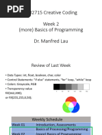 Time: 2D Modes: ellipseMode(CENTER/RADIUS/ CORNERS) rectMode(CENTER/RADIUS/CORNERS) smooth() - smoothens edges noSmooth() - jagged edges strokeCap(ROUND/SQUARE/PROJECT) strokeJoin(MITER/BEVEL/ROUND) strokeWeight(weight) Monitor: print() - prints without linespace printArray() - print array values Mouse: mouseButton - LEFT/RIGHT/CENTER mouseClicked() - calls a function when mouse is clicked mouseDragged() - calls a function when mouse is dragged mouseMoved() - calls function when mouse is moved mousePressed() - calls function when mouse is pressed mousePressed - variable for mouse press mouseReleased() - calls a function when mouse is released Images: PImage img - define image name loadImage() - gets image image(img,width,height) tint(r,g,b,alpha) - image transparency println() - print with linespace day() - returns day 1-31 hour() - returns hour 0-23 minute() - returns minutes 0-59 month() - returns month 1-12 second() - returns seconds 0-59 year() - returns year
