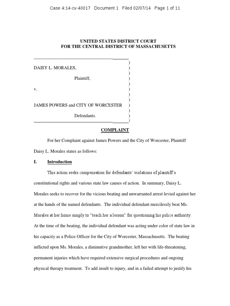 For her Complaint against James Powers and the City of Worcester, Plaintiff Daisy L. Morales states as follows:
