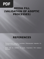 example, slower line speed, personnel shift changes, equipment failure and repair, mock lyophilization and substitution of vial headspace gas. 11. Microbiological monitoring The microbiological monitoring data obtained during the media fill runs should be provided (see Chapter 4 section 6 of this guidance). 12. Process parameters The parameters used for production filling and for media fills (e.g., line speed, fill volume, number of containers filled, or duration of fill) should be compared. Section 5 Actions Concerning Product When Media Fills Fail The disposition of product made before and after a failed media fill should be described. The description should include details of investigations, reviews, and how decisions are made to reject or release product. Section 6 Microbiological Monitoring of the Environment The microbiological monitoring program used during routine production and media fills should be described. The frequency of monitoring, type of monitoring, sites monitored, alert and action level specifications and precise descriptions of the actions taken when specifications are exceeded should be included. 1. Microbiological Methods The microbiological materials and methods used in the environmental monitoring program should be described. Methods may include sample collection, transport, and neutralization of sanitizers, incubation, and calculation of results.