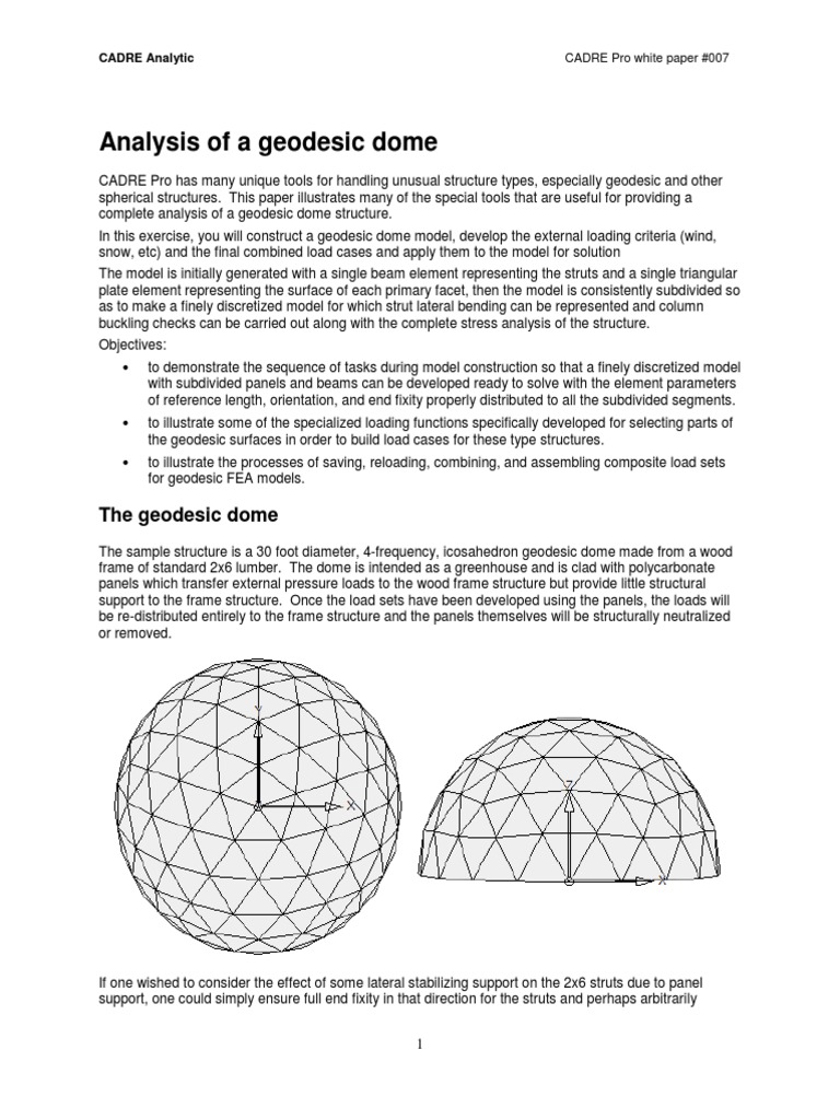 This document provides instructions for analyzing a geodesic dome structure using finite element analysis software. It describes constructing a model of a 30 foot diameter wood frame geodesi…