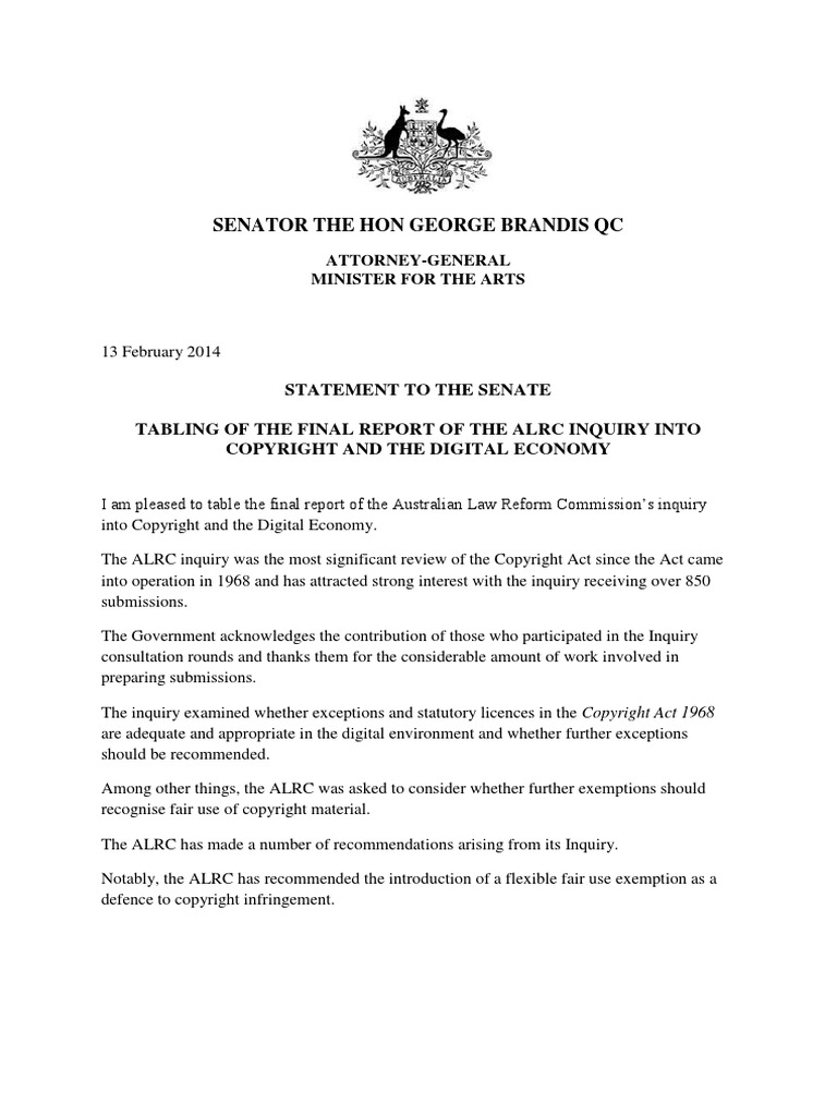 STATEMENT TO THE SENATE TABLING OF THE FINAL REPORT OF THE ALRC INQUIRY INTO COPYRIGHT AND THE DIGITAL ECONOMY
