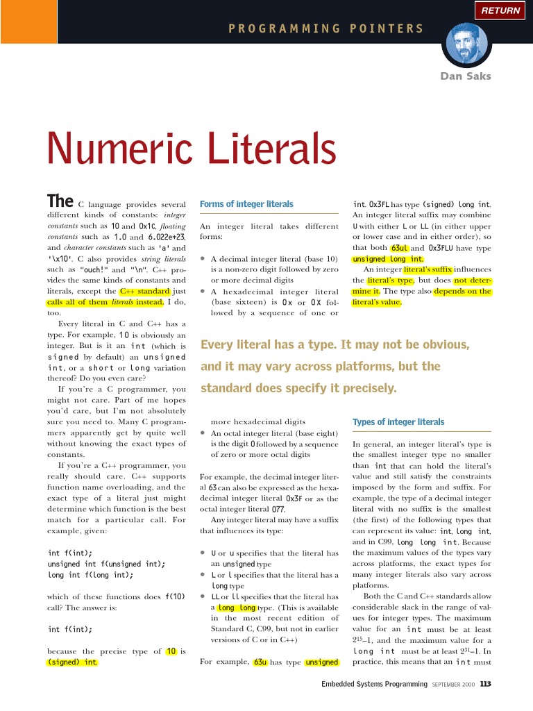 Integer and floating literals are essentially the same in both C and C++. The differences lie in Cs added support for long long integer types and hexadecimal floating literals. In contrast, character and string literals behave slightly differently between C and C++. Those differences are my topic for next time. esp Dan Saks is the president of Saks & Associates, a C/C++ training and consulting company. He is also a consulting editor for the C/C++ Users Journal. He served for many years as secretary of the C++ standards committee. With Thomas Plum, he wrote C++ Programming Guidelines (Plum Hall). You can write to him at dsaks@wittenberg.edu.