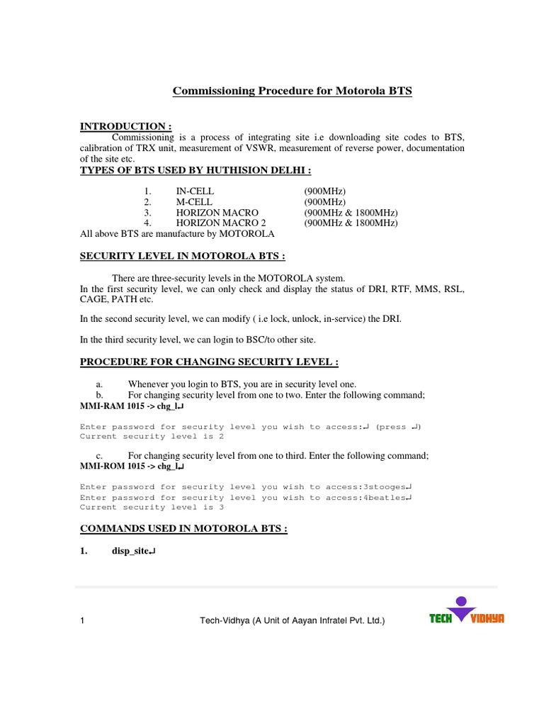 a. b. Whenever you login to BTS, you are in security level one. For changing security level from one to two. Enter the following command;