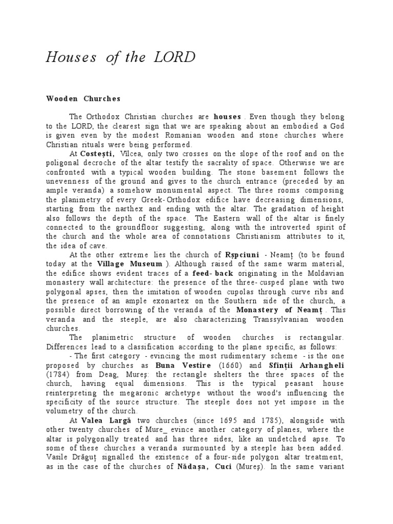 Wood e n Church e s The Orthodox Christian church e s are hou s e s . Even though they belong to the LORD, the cleare s t sign that we are spe aking about an e bodie d a !od is given even by the od e s t Ro a nia n wooden and stone church e s where Christian rituals were being per"or e d . #t Cost e t i , $%lcea, only two cross es on the slope o" the roo" and on the poligon al decroch e o" the altar testi"y the sacrality o" space. Otherwise we are con"ront e d with a typical woode n building. The stone bas e e n t "ollows the uneve n n e s s o" the ground and gives to the church entra nc e &prece d e d by an a ple veran d a ' a so e h ow onu e n t al aspect. The thre e roo s co posing the plani e tr y o" every !reek( Orthodox edi"ice have decre a sing di en sions, starting "ro the narth e x and ending with the altar. The grad a tion o" height also "ollows the depth o" the spac e. The Eastern wall o" the altar is "inely connect e d to the ground"loor sugg e s ting, along with the introvert e d spirit o" the church and the whole area o" connot a tions Christianis attribut e s to it, the idea o" cave. #t the other extre e lies the church o" Rp ciu n i ( )ea * &to be "ound today at the Villag e Mus e u m '. #lthough raised o" the sa e war at erial, the edi"ice shows evident traces o" a fe e d - back originating in the +oldavian ona s t e r y wall architectur e, the pres e n c e o" the three( cuspe d plane with two polygon al aps es, then the i itation o" wooden cupolas through curve ribs and the pres e n c e o" an a ple exon art e x on the -outh ern side o" the church, a possible direct borrowing o" the veran d a o" the Mon a s t e r y of Nea m . This veran d a and the stee ple, are also charact e ri.ing Transs ylvania n woode n church e s. The plani e tric structur e o" wooden churche s is recta n g ular. Di""erenc e s lead to a classi"ication according to the plane speci"ic, as "ollows, ( The "irst cate gory ( evincing the ost rudi e n t a r y sche e ( is the one propos e d by church e s as una Ves tir e &/001' and !finii "rhan g h e l i &/234' "ro Deag, +ure5, the recta n gle shelters the three space s o" the church, having e6u al di ensions. This is the typical peas a n t hous e reinterpr e tin g the eg ar o nic archet yp e without the wood7s in"luencing the speci"icity o" the source structur e. The stee ple does not yet i pos e in the volu e tr y o" the church. #t Vale a #arg$ two church e s &since /089 and /239', alongside with other twenty churche s o" +ure: evince anoth er categ ory o" planes, where the altar is polygon ally treat e d and has three sides, like an undetc h e d aps e. To so e o" thes e church e s a verand a sur ou n t e d by a stee ple has been add e d. $asile Dr;gu* signalled the existenc e o" a "our( side polygon altar treat e n t , as in the cas e o" the church e s o" N$d a a , Cuci &+ure5'. <n the sa e variant