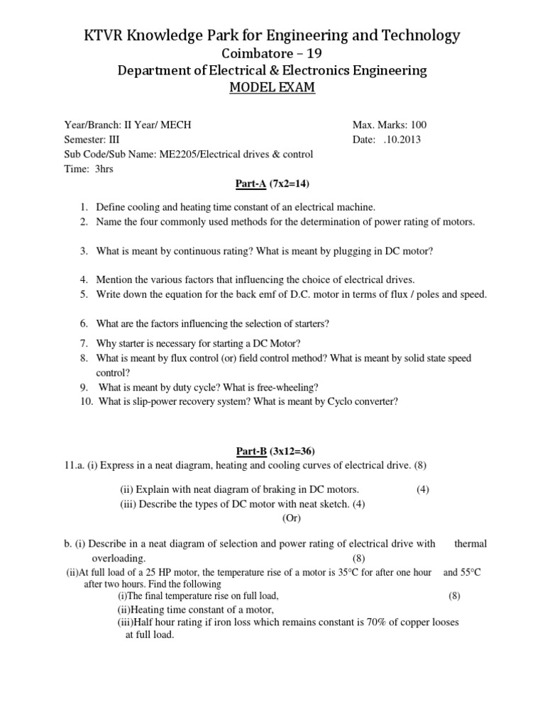 Year/Branch: II Year/ MECH Semester: III Sub Code/Sub Name: ME2205/Electrical drives & control Time: 3hrs Part-A (7x2=14) Max. Marks: 100 Date: .10.2013