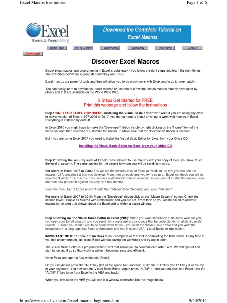 Discovering macros and programming in Excel is quite easy if you follow the right steps and learn the right things. The exercises below are a great start and they are FREE. Excel macros are powerful tools and they will allow you to do much more with Excel and to do it more rapidly. You can easily learn to develop your own macros or use one of a few thousands macros already developed by others and that are available on the World Wide Web.