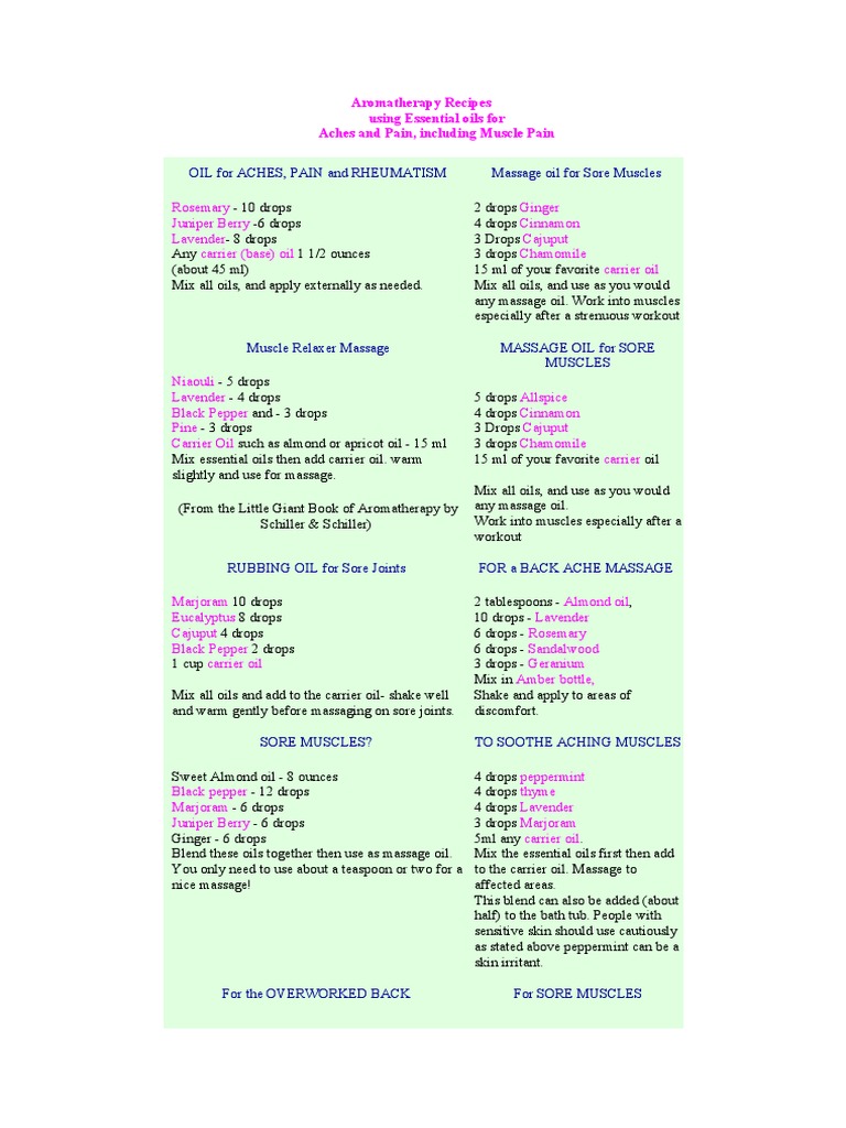 PAIN and RHEUMATISM Rosemary - 10 drops J n!per "erry -# drops La$ender- % drops Any &arr!er '(ase) o!* 1 1+, o n&es 'a(o - ./ m*) M!0 a** o!*s, and app*y e0-erna**y as needed1 Massa2e o!* for Sore M s&*es , drops 3!n2er . drops C!nnamon 4 5rops Ca6 p 4 drops C7amom!*e 1/ m* of yo r fa$or!-e &arr!er o!* M!0 a** o!*s, and se as yo 8o *d any massa2e o!*1 9or: !n-o m s&*es espe&!a**y af-er a s-ren o s 8or:o MASSA3E OIL for SORE MUSCLES / drops A**sp!&e . drops C!nnamon 4 5rops Ca6 p 4 drops C7amom!*e 1/ m* of yo r fa$or!-e &arr!er o!* M!0 a** o!*s, and se as yo 8o *d any massa2e o!*1 9or: !n-o m s&*es espe&!a**y af-er a 8or:o ;OR a "AC= ACHE MASSA3E , -a(*espoons - A*mond o!*, 10 drops - La$ender # drops - Rosemary # drops - Sanda*8ood 4 drops - 3eran! m M!0 !n Am(er (o--*e, S7a:e and app*y -o areas of d!s&omfor-1 TO SOOTHE ACHIN3 MUSCLES . drops pepperm!n. drops -7yme . drops La$ender 4 drops Mar6oram /m* any &arr!er o!*1 M!0 -7e essen-!a* o!*s f!rs- -7en add -o -7e &arr!er o!*1 Massa2e -o affe&-ed areas1 T7!s (*end &an a*so (e added 'a(o 7a*f) -o -7e (a-7 - (1 Peop*e 8!-7 sens!-!$e s:!n s7o *d se &a -!o s*y as s-a-ed a(o$e pepperm!n- &an (e a s:!n !rr!-an-1 ;or SORE MUSCLES