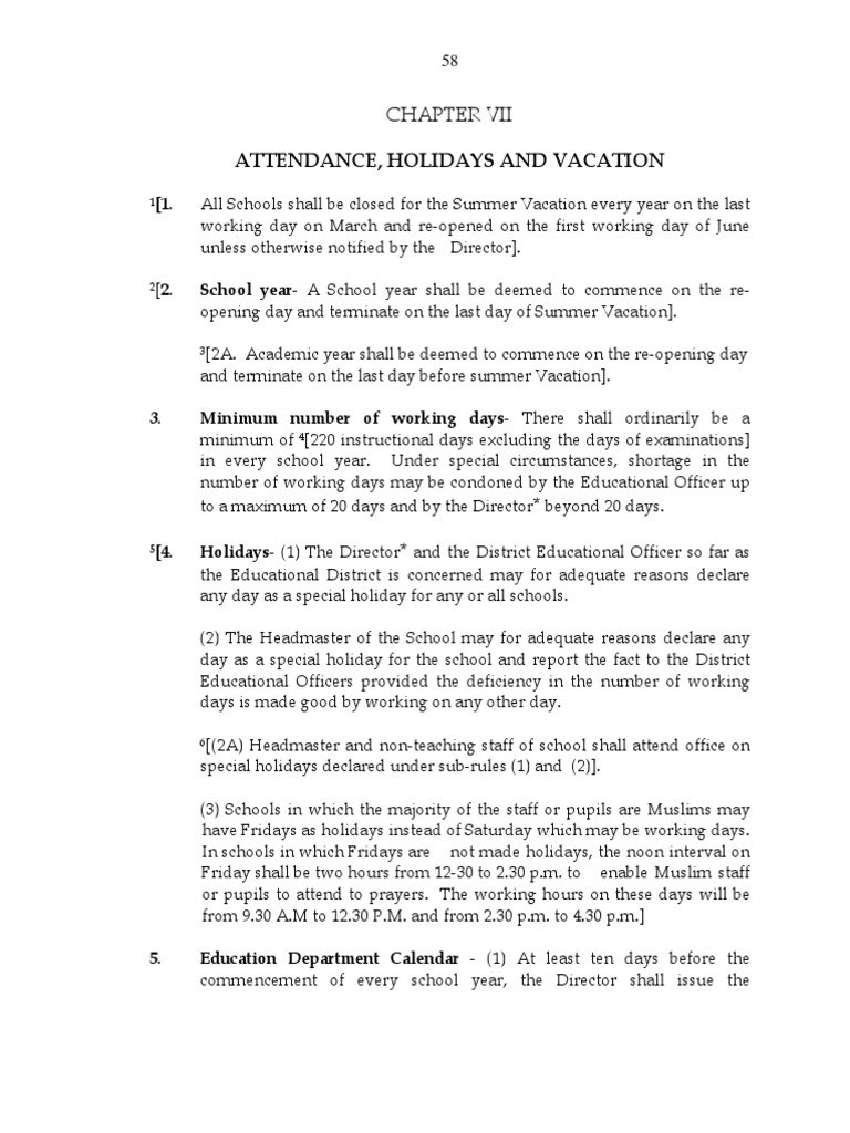 Headmaster and non-teaching staff of school shall attend office on special holidays declared under sub-rules (1) and (2)]. (3) Schools in which the majority of the staff or pupils are Muslims may have Fridays as holidays instead of Saturday which may be working days. In schools in which Fridays are not made holidays, the noon interval on Friday shall be two hours from 12-30 to 2.30 p.m. to enable Muslim staff or pupils to attend to prayers. The working hours on these days will be from 9.30 A.M to 12.30 P.M. and from 2.30 p.m. to 4.30 p.m.] 5. Education Department Calendar - (1) At least ten days before the commencement of every school year, the Director shall issue the
