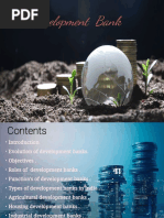 :overnment formulates financial policies with the help of development banks. The! also help in implementing these policies. ,or e'ample, /%.%1D bank is set up as an ape' development bank for e'tending support to the rural areas. It helps the government in matters relating to the rural development, offers training and research facilities for banks working in the field of rural development, and acts as a regulator for co)operative banks and 11.'s.