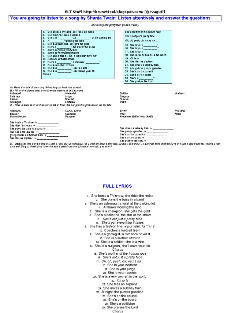 Shes not just a pretty face (Shania Twain) 1. She hosts a TV show, she rides the rodeo 2. She plays the bass in a band 3. Shes an __________1, a __________2 at the parking lot 4. __________3 working the land !. She is a "ha#pion, she gets the gold $. Shes a __________4, the star o% the show &. Shes not just a pretty face '. Shes got everything it takes (. She has a %ashion line, a )o*rnalist %or +Ti#e 1,. -oa"hes a %ootball tea# 11. Shes a __________!, a ro#an"e __________$ 12. She is a #other o% three 13. She is a __________&, she is a wi%e 14. She is a __________', shell sa.e yo*r li%e Chorus Shes mother of the human race Shes not just a pretty face Oh, oh, yeah, oh, na na na... 1!. 1$. 1&. 1'. 1(. 2,. 21. 22. 23. 24. 2!. 2$. She is yo*r __________( She is yo*r __________1, She is yo*r __________11 She is [Link] wo#an in the world Oh la la She %lies an airplane She [Link] a s*bway train t night she p*#ps gasoline Shes on the "o*n"il Shes on the board Shes a __________12 She praises the /ord