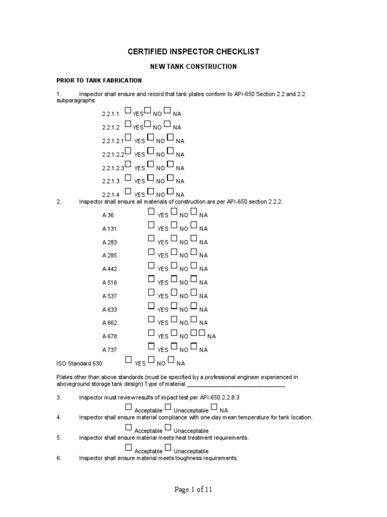 Acceptable 1nacceptable Inspector shall ensure raised-t+pe bolted door sheets conform to API-650 Appendi, A section A.11. Acceptable 1nacceptable Inspector shall use the checklist for large tanks for the foundation inspection. !"S #$ Inspector shall use the checklist for large tanks for the h+drostatic inspection. !"S #$