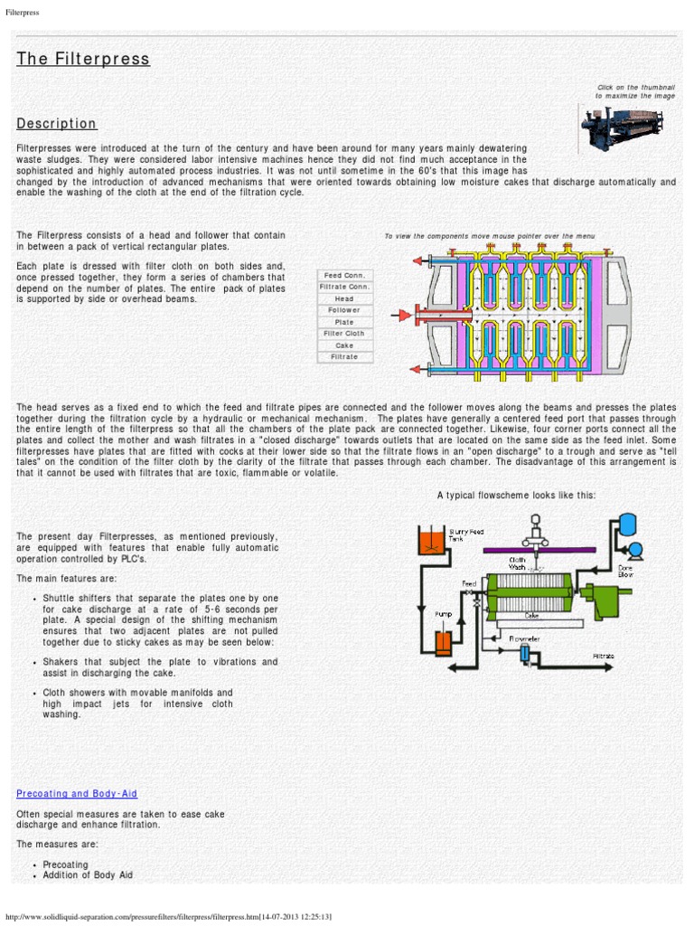 Filterpresses are best selected in the following instances: When a very low moisture content is required for thermal cake drying or incineration. When high filtrate clarity is required for polishing applications. When good cake release assisted by squeezing is required. When the cake is disposed as land fill for spreading with a bulldozer provided it is hard enough to carry its weight. When large filtration areas are required in a limited space. They should be selected with care: When filtering saturated brines since the plates cool-off during cake discharge and require preheating prior to feeding the process slurry. For such brines autoclaved filters such as Horizontal Plates, Vertical Leaf or Candle Filters are better suited as they can be steam jacketed. When there is a risk of environmental hazard from toxic, flammable or volatile cakes when the plates are opened for discharge at the end of each cycle. Again, the autoclaved filters are better suited. When efficient washing is required since with a chamber filled with cake the wash water may not reach all its surface causing an uneven displacement. This, however, should present no problem when a gap is left between the formed cakes within a chamber so that the wash