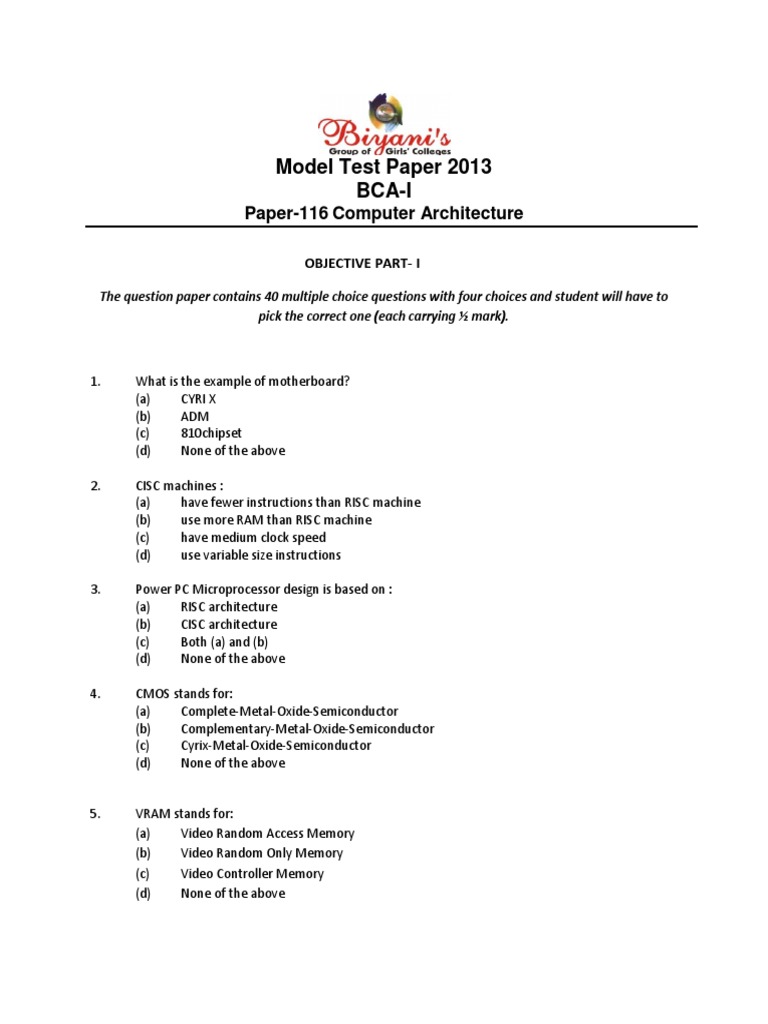What is the example of motherboard? (a) CYRI X (b) ADM (c) 810chipset (d) None of the above CISC machines : (a) have fewer instructions than RISC machine (b) use more RAM than RISC machine (c) have medium clock speed (d) use variable size instructions Power PC Microprocessor design is based on : (a) RISC architecture (b) CISC architecture (c) Both (a) and (b) (d) None of the above CMOS stands for: (a) Complete-Metal-Oxide-Semiconductor (b) Complementary-Metal-Oxide-Semiconductor (c) Cyrix-Metal-Oxide-Semiconductor (d) None of the above