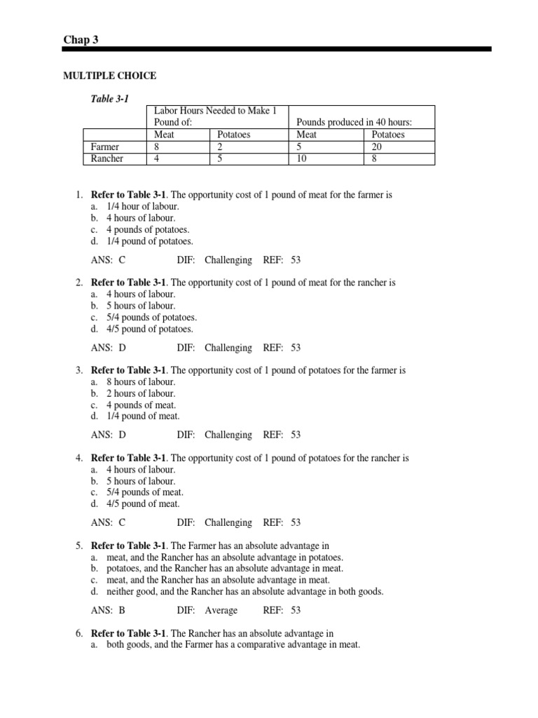 4. Refer to Table 3-1. The opportunity cost of 1 pound of potatoes for the rancher is a. 4 hours of labour. b. 5 hours of labour. c. 5/4 pounds of meat. d. 4/5 pound of meat. ANS: C DIF: Challenging REF: 53