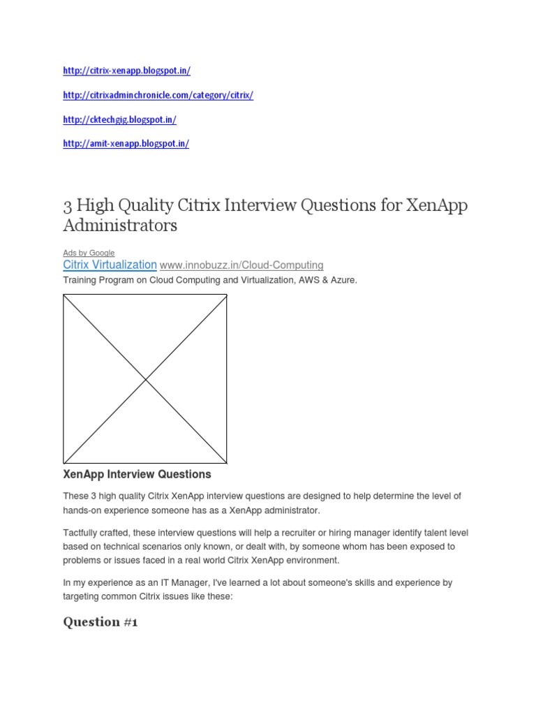These Citrix XenApp interview questions cover 3 of the more common issues faced in Citrix environments. Someone answering all 3 questions with relevant knowledge will get a second interview. In addition to these questions, other key topics for XA interview questions are:
