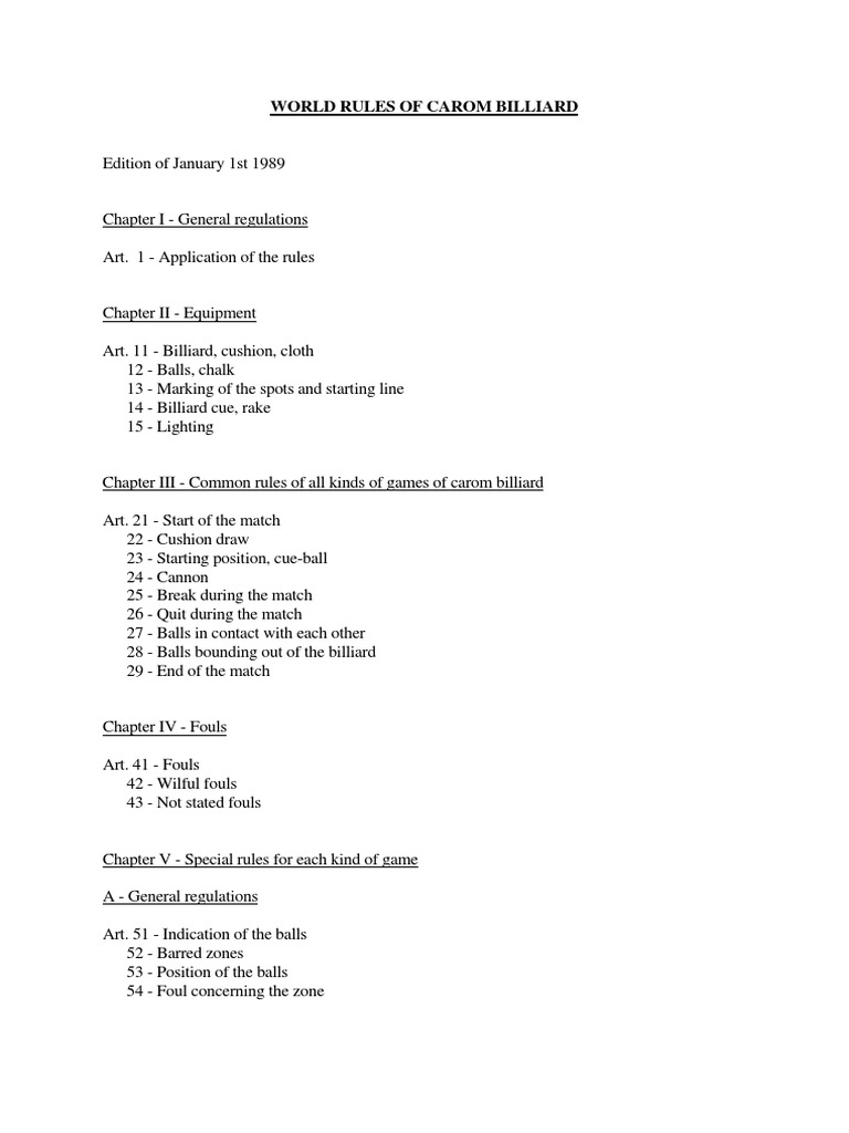 Chapter V - Special rules for each kind of game A - General regulations Art. 51 - Indication of the balls 52 - Barred zones 53 - Position of the balls 54 - Foul concerning the zone