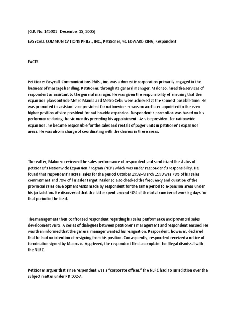 Petitioner Easycall Communications Phils., Inc. was a domestic corporation primarily engaged in the business of message handling. Petitioner, through its general manager, Malonzo, hired the services of respondent as assistant to the general manager. He was given the responsibility of ensuring that the expansion plans outside Metro Manila and Metro Cebu were achieved at the soonest possible time. He was promoted to assistant vice president for nationwide expansion and later appointed to the even higher position of vice president for nationwide expansion. Respondents promotion was based on his performance during the six months preceding his appointment. As vice president for nationwide expansion, he became responsible for the sales and rentals of pager units in petitioners expansion areas. He was also in charge of coordinating with the dealers in these areas.