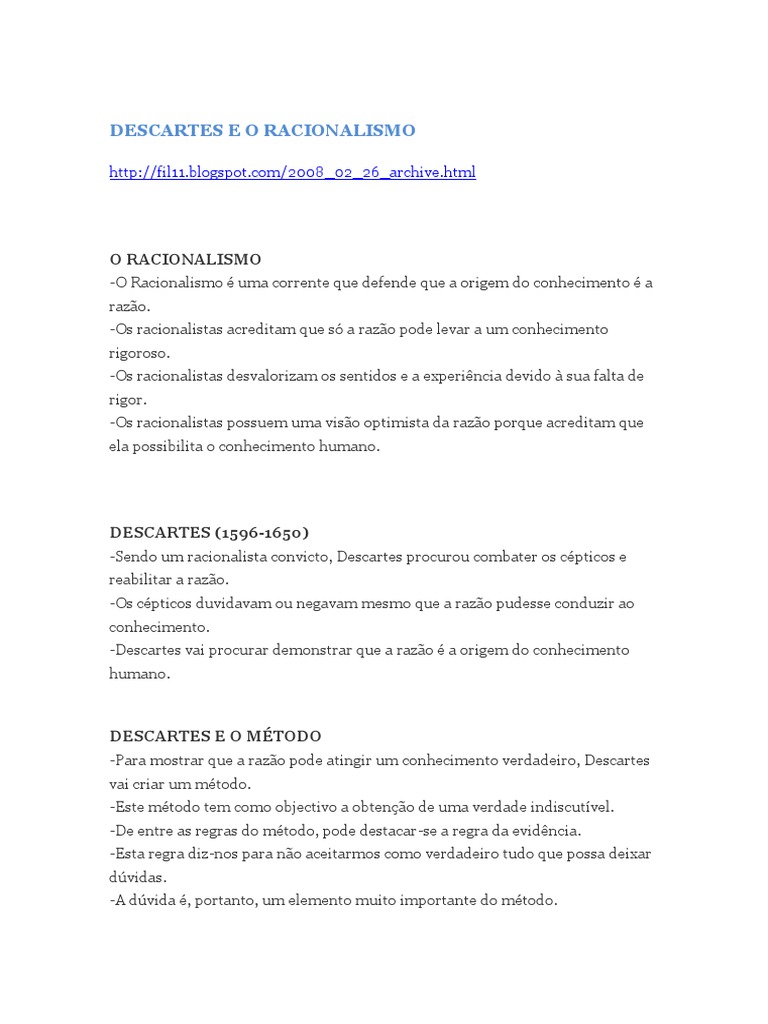 O RACIONALISMO -O Racionalismo é uma corrente que defende que a origem do conhecimento é a razão. -Os racionalistas acreditam que só a razão pode levar a um conhecimento rigoroso. -Os racionalistas desvalorizam os sentidos e a experiência devido à sua falta de rigor. -Os racionalistas possuem uma visão optimista da razão porque acreditam que ela possibilita o conhecimento humano.