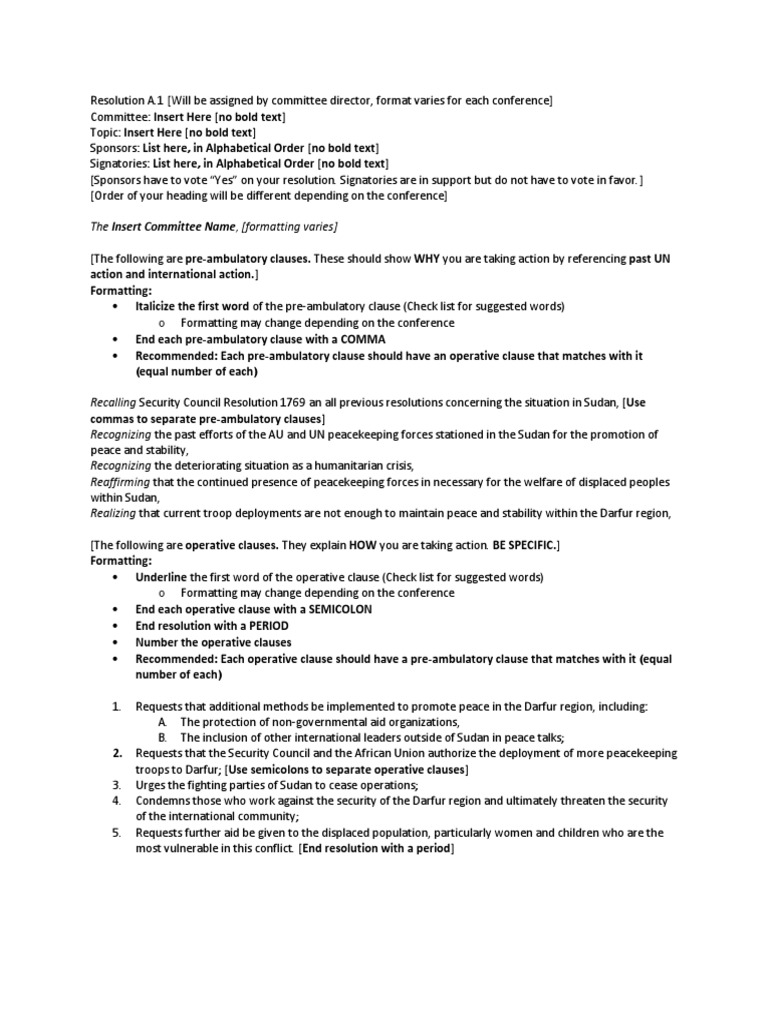 1 [Will be assigned by committee director, format varies for each conference] Committee: Insert Here [no bold text] Topic: Insert Here [no bold text] Sponsors: List here, in Alphabetical Order [no bold text] Signatories: List here, in Alphabetical Order [no bold text] [Sponsors have to vote Yes on your resolution. Signatories are in support but do not have to vote in favor. ] [Order of your heading will be different depending on the conference] The Insert Committee Name, [formatting varies] [The following are pre-ambulatory clauses. These should show WHY you are taking action by referencing past UN action and international action.] Formatting: Italicize the first word of the pre-ambulatory clause (Check list for suggested words) o Formatting may change depending on the conference End each pre-ambulatory clause with a COMMA Recommended: Each pre-ambulatory clause should have an operative clause that matches with it (equal number of each) Recalling Security Council Resolution 1769 an all previous resolutions concerning the situation in Sudan, [Use commas to separate pre-ambulatory clauses] Recognizing the past efforts of the AU and UN peacekeeping forces stationed in the Sudan for the promotion of peace and stability, Recognizing the deteriorating situation as a humanitarian crisis, Reaffirming that the continued presence of peacekeeping forces in necessary for the welfare of displaced peoples within Sudan, Realizing that current troop deployments are not enough to maintain peace and stability within the Darfur region, [The following are operative clauses. They explain HOW you are taking action. BE SPECIFIC.] Formatting: Underline the first word of the operative clause (Check list for suggested words) o Formatting may change depending on the conference End each operative clause with a SEMICOLON End resolution with a PERIOD Number the operative clauses Recommended: Each operative clause should have a pre-ambulatory clause that matches with it (equal number of each) 1. Requests that additional methods be implemented to promote peace in the Darfur region, including: A. The protection of non-governmental aid organizations, B. The inclusion of other international leaders outside of Sudan in peace talks; Requests that the Security Council and the African Union authorize the deployment of more peacekeeping troops to Darfur; [Use semicolons to separate operative clauses] Urges the fighting parties of Sudan to cease operations; Condemns those who work against the security of the Darfur region and ultimately threaten the security of the international community; Requests further aid be given to the displaced population, particularly women and children who are the most vulnerable in this conflict. [End resolution with a period]