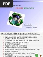 Health and Safety Issue Potential for unexpected release and hazardous uncontrolled swinging of the skip and overbalancing of the skip lorry. This can occur when the tipping hooks fail to engage with the catch bar on the skip but temporarily snag on a lip protruding from the base of the skip instead. During tipping the hooks are pushed off the lip which releases the skip causing it to swing, the momentum of which may cause the front of the lorry to lift and may result in the lorry overbalancing. Skips should be examined and modified as applicable so as to ensure the hooks engage only on the catch bar. People in commercial waste containers. Risk of serious injury or death. New guidance issued to help those producing, storing or collecting commercial waste to eliminate or minimize the risks. CONCLUSION Monitors & CRT, keyboards, laptops, modems, telephone boards, hard drives, floppy drives, Compact disks, mobiles, fax machines, printers, CPUs, memory chips, connecting wires & cables can be recycled. Recycling involves dismantling i.e. removal of different parts of e-waste containing dangerous substances like PCB, Hg, separation of plastic, removal of CRT, segregation of ferrous and non-ferrous metals and printed circuit boards. Recyclers use strong acids to remove precious metals such as copper, lead, gold. The value of recycling from the element could be much higher if appropriate technologies are used. The recyclers working in poorlyventilated enclosed areas without mask and technical expertise results in exposure to dangerous and slow poisoning chemicals. The existing dumping grounds in India are full and overflowing beyond capacity and it is difficult to get new dumping sites due to scarcity of land. Therefore recycling is the best possible option for the management of e-waste. If a local authority, business or charity collects and segregates non-household WEEE for re-use, the re-usable WEEE will only cease to be waste at the time of segregation if there is an auditable system that ensures that almost all of the items segregated will in fact be re-used (following repair if necessary). In describing the amount of electronic products sold, stored, recycled, disposed of, and exported in the United States, we made a series of assumptions and estimates because information was not always complete or current, and it was sometimes developed for purposes other than deriving national estimates. The products covered in this analysis are: Televisions Personal computers (desktops, laptops, portables, and computer monitors) Hard copy computer peripherals (including printers, scanners, and fax machines) Computer mice Keyboards