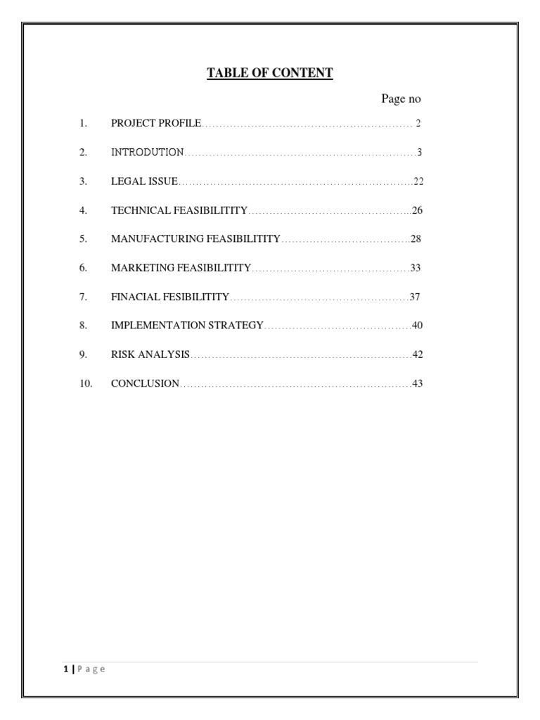 1. 2. 3. 4. 5. 6. 7. 8. 9. 10. PROJECT PROFILE 2 INTRODUTION3 LEGAL ISSUE.22 TECHNICAL FEASIBILITITY..26 MANUFACTURING FEASIBILITITY.28 MARKETING FEASIBILITITY33 FINACIAL FESIBILITITY37 IMPLEMENTATION STRATEGY40 RISK ANALYSIS42 CONCLUSION43