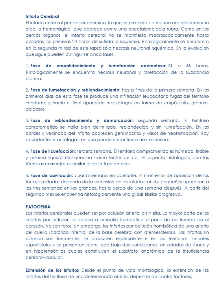 aparece como una encefalomalacia rubra. Como en los dems rganos, el infarto cerebral no se manifiesta macroscpicamente hasta pasadas las primeras 24 horas de sufrida la isquemia. Histolgicamente se encuentra en la segunda mitad de este lapso slo necrosis neuronal isqumica. En la evolucin que sigue pueden distinguirse cinco fases: 1. Fase de empalidecimiento y tumefaccin edematosa: 24 a 48 horas. Histolgicamente se encuentra necrosis neuronal y rarefaccin de la substancia blanca. 2. Fase de tumefaccin y reblandecimiento: hasta fines de la primera semana. En los primeros das de esta fase se produce una infiltracin leucocitaria fugaz del territorio infartado, y hacia el final aparecen macrfagos en forma de corpsculos grnuloadiposos. 3. Fase de reblandecimiento y demarcacin: segunda semana. El territorio comprometido se halla bien delimitado, reblandecido y sin tumefaccin. En los bordes y vecindad del infarto aparecen gemistocitos y vasos de neoformacin. Hay abundantes macrfagos, en que puede encontrarse hemosiderina. 4. Fase de licuefaccin: tercera semana. El territorio comprometido es hmedo, friable y rezuma lquido blanquecino como leche de cal. El aspecto histolgico con las tcnicas corrientes es similar al de la fase anterior. 5. Fase de cavitacin: cuarta semana en adelante. El momento de aparicin de los focos cavitados depende de la extensin de los infartos: en los pequeos aparecen a las tres semanas; en los grandes, hasta cerca de una semana despus. A partir del segundo mes se encuentra histolgicamente una gliosis fibrilar progresiva. PATOGENIA Los infartos cerebrales pueden ser por oclusin arterial o sin ella. La mayor parte de los infartos por oclusin se deben a embolia trombtica a partir de un trombo en el corazn. No son raros, sin embargo, los infartos por oclusin trombtica de una arteria del cuello (cartida interna) de la base cerebral con ateroesclerosis. Los infartos sin oclusin son frecuentes, se producen especialmente en los territorios limtrofes superficiales y se presentan sobre todo bajo dos condiciones: en estados de shock y en hipotensin las cuales constituyen el substrato anatmico de la insuficiencia cerebro-vascular. Extensin de los infartos Desde el punto de vista morfolgico, la extensin de los infartos del territorio de una determinada arteria, depende de cuatro factores: