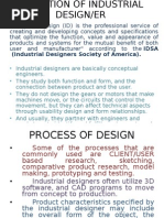 INDUSTRIAL DESIGN? The industrial Designers Society of America (IDSA) defines industrial design as the professional service of creating and developing concepts and specifications that optimize the function, value, and appearance of products and systems for the mutual benefit of both user and manufacturer. Dreyfuss (1967) lists five critical goals that industrial designers can help a team to achieve when developing new products: Utility:-The product`s human interfaces should be safe, easy to use, and intuitive . Appearance:-Form, Line, color and proportion are used to integrate the product into a pleasing whole. Ease of maintenance:-How easy they are to be maintained and repaired. Low costs:-Form and features must be considered jointly by the team. Communication:-Product design should communicate the corporate design philosophy and mission.
